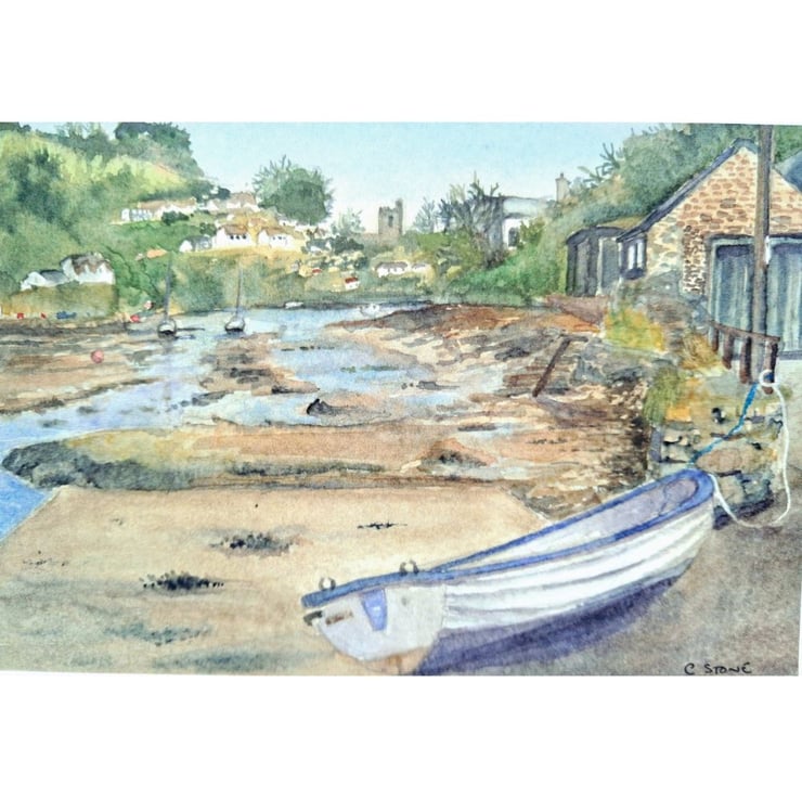 A professionally produced greetings card printed from my original watercolour painting of Noss Mayo, in Devon's beautiful South Hams, viewed from the creek at Bridgend.