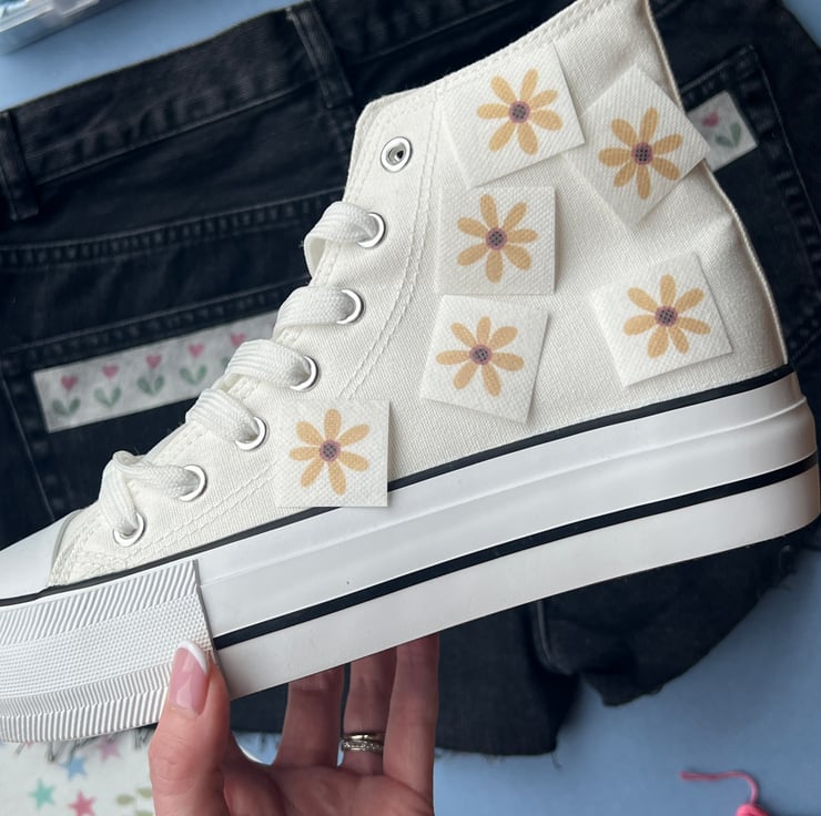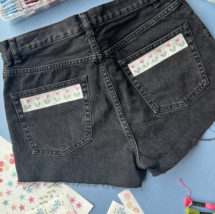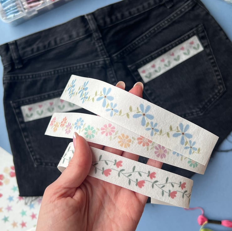 A collection of 10 border designs to stick and sew on your clothing. Each design is duplicated so you can use on themcuffs, pockets, pairs of high tops, or to have two items of clothing that match! Simply stick, stitch and wash away. Some designs can be cut out individually so they can be scattered across garments as well as used as a border.