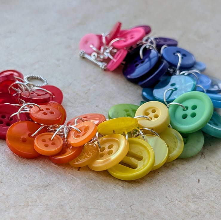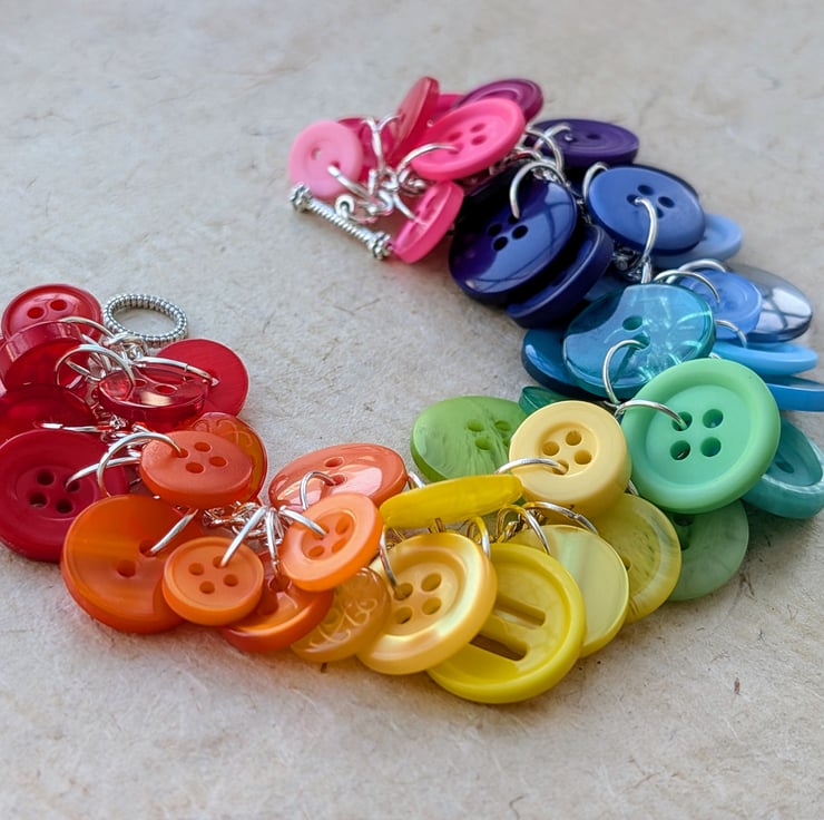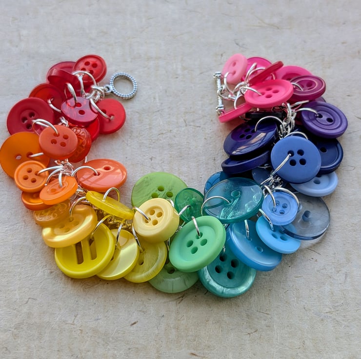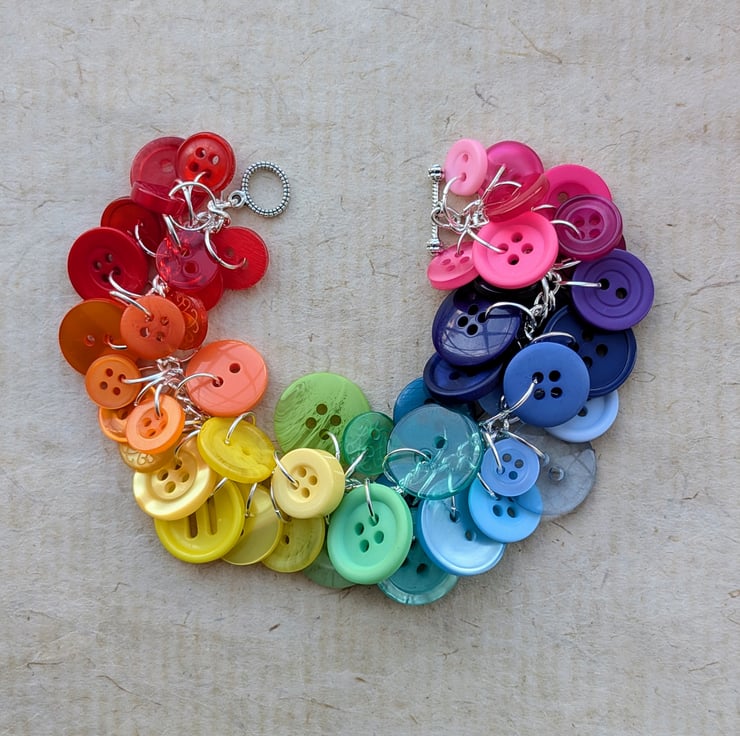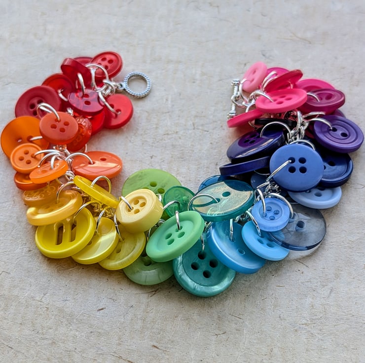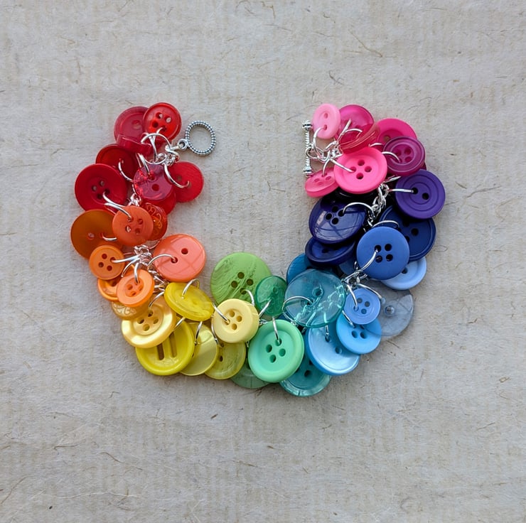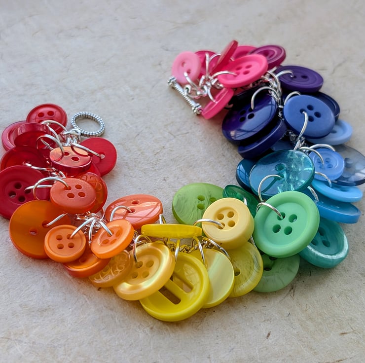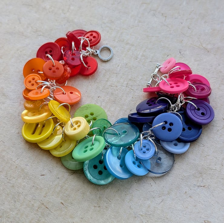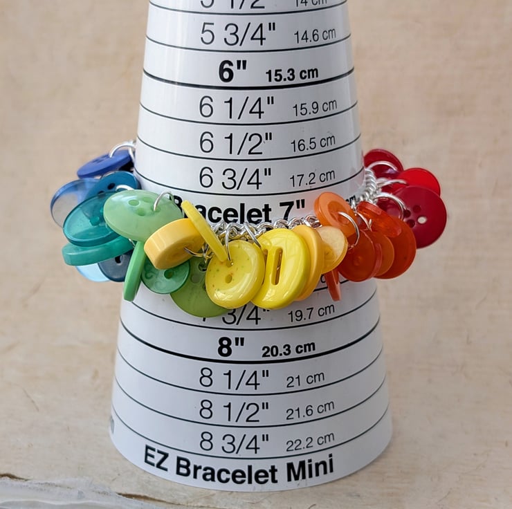 This joyful bracelet is made with a silver-plated chain base and packed with colourful buttons in every shade of the rainbow — red, orange, yellow, green, blue, indigo and violet. It fastens with a decorative toggle clasp and measures approximately 7.5 inches long.