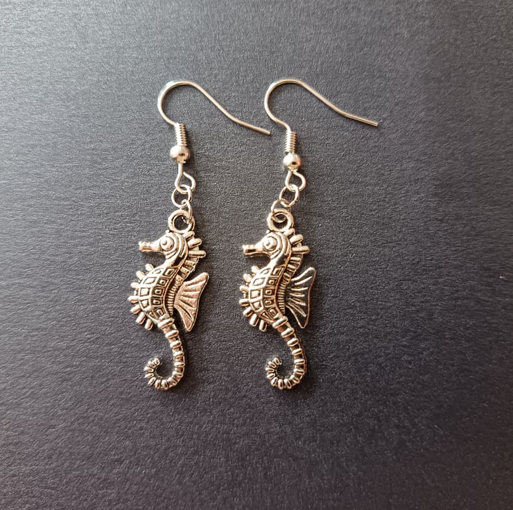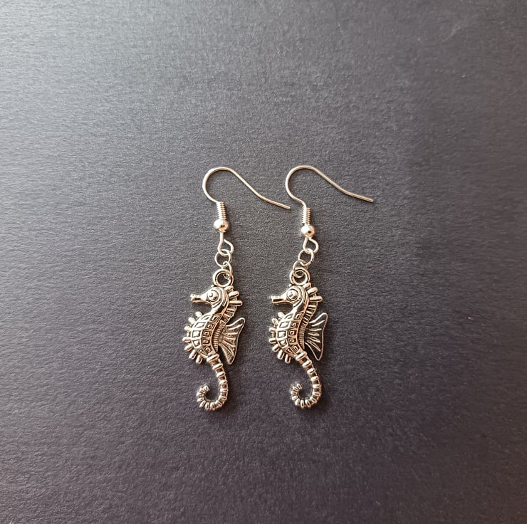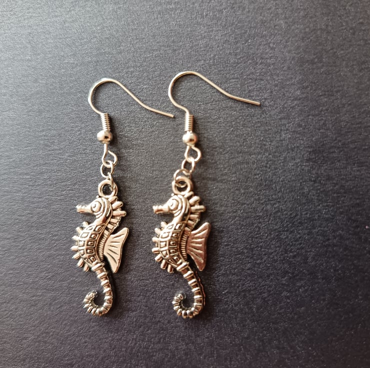 These earrings are handmade and crafted with silver seahorse charms and stainless steel silver earring hooks. Another nautical piece showcasing sea animals, with summer beach vibes and would make an ideal gift for seahorse lovers