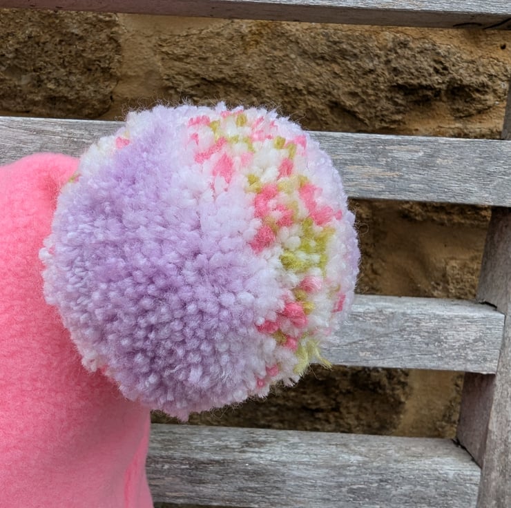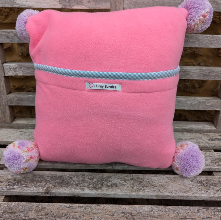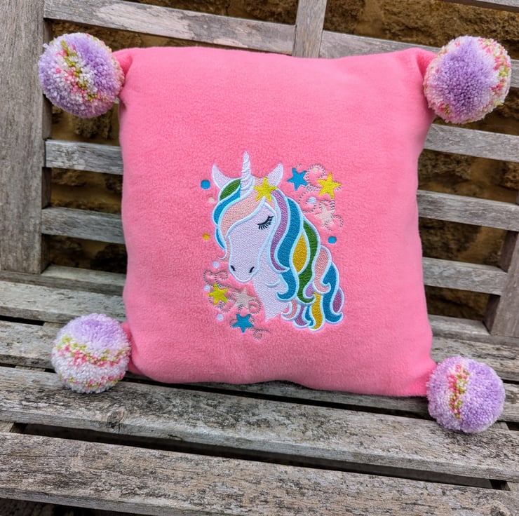 A 16" square cushion. Bright pink fleece with a charming machine embroidered unicorn. It has an envelope style, so there is no need for a zip. There is a cushion pad which comes within the price. Hand made pom poms on each corner. Their colour may vary slightly from the picture. A lovely addition to any girl's bedroom. Such a cuddly cushion. Would make an ideal present.