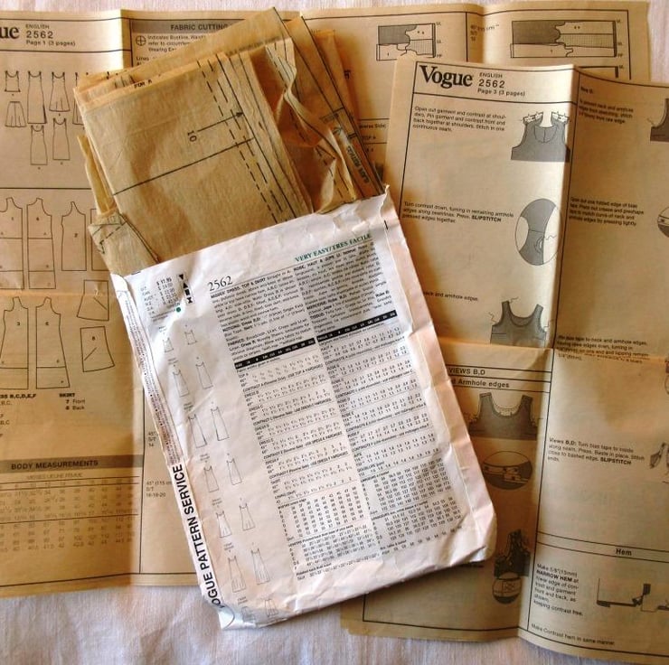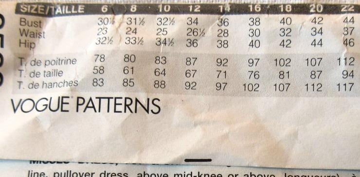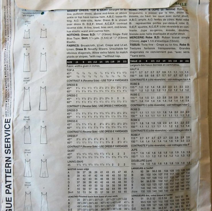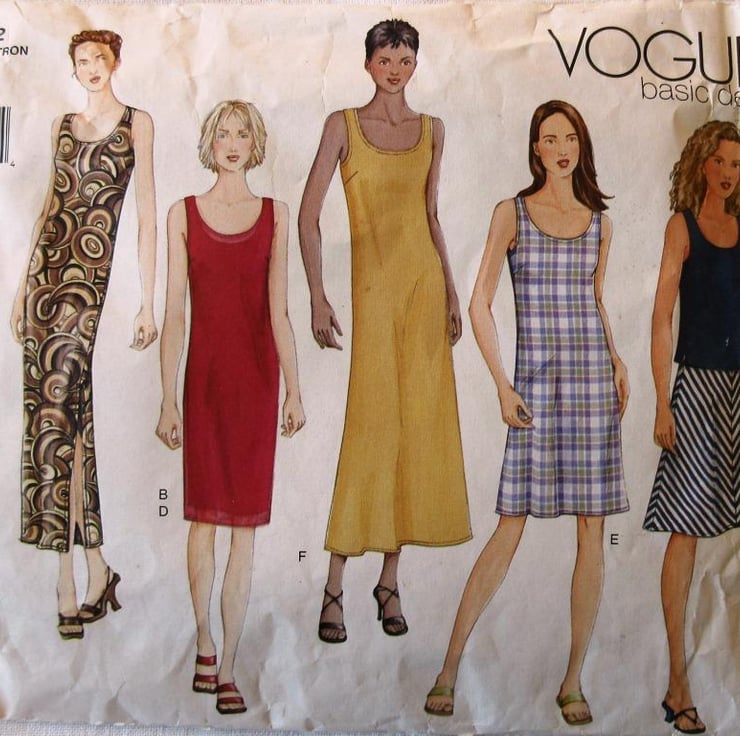 A multi-size sewing pattern for a misses' dress, top and skirt in sizes 6 - 8 - 10 (bust 30.5"/78 cm - 31.5"/80 cm - 32.5 cm/83 cm, Vogue 2562). Straight or A-line pullover dress, above mid-knee or above ankle, or top have narrow hem. A, B and C are loose-fitting. A and C have side slits. Dress B is shown over dress D. D, E and F are fitted. The A-line bias skirt is lined, mid-knee length and has elastic waist and narrow hem. The pattern has been used to make view C and view D in size 10, so all sizes are still usable. It is dated 2001.