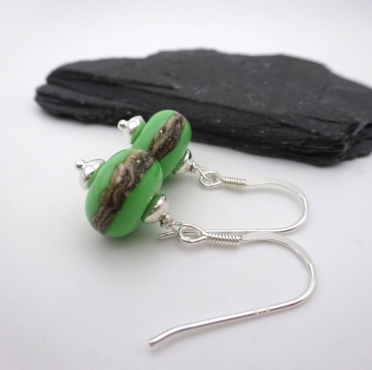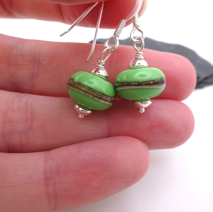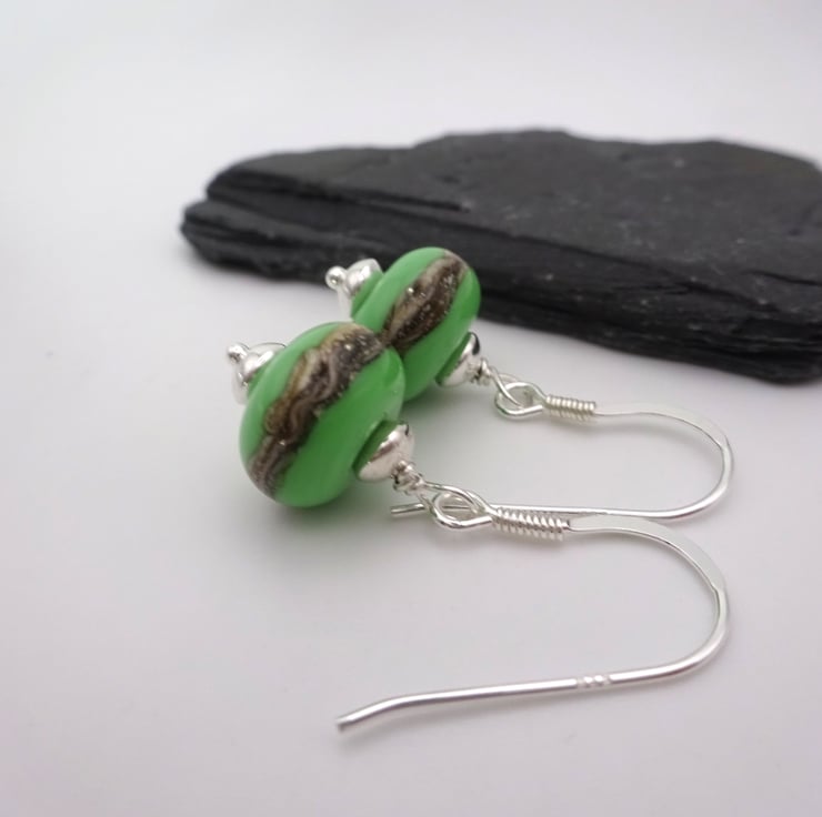 A pair of earrings made with sterling silver ear wires, sterling silver beads and handmade lampwork glass beads.