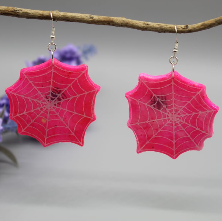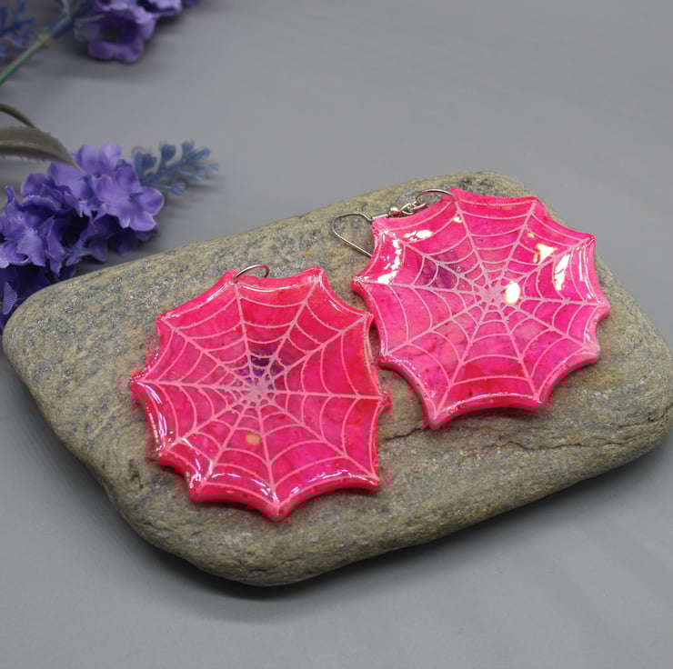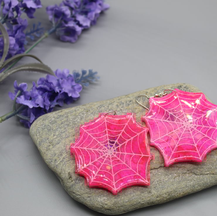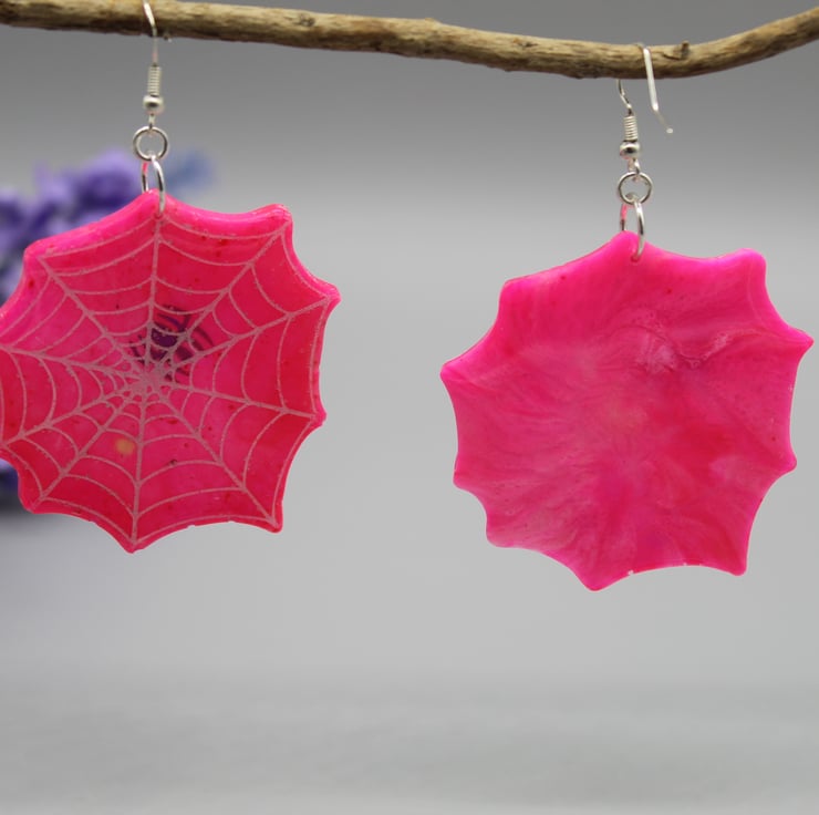 These amazing statement spider web earrings have been made with epoxy resin coloured in neon pink and white. While making these spooktacular earrings, I put in a single purple holographic glitter spider before pouring the resin in, which is where the spider silhouette comes from.