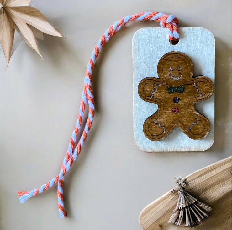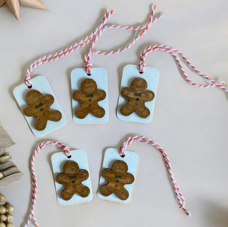 Set of 5 wooden gift tags each tag has a cute laser engraved hand painted gingerbread man design. Made from natural wood for a warm, rustic feel and include twine for easy tying onto gifts or decorations