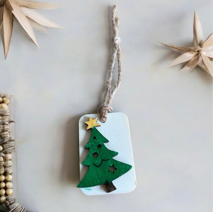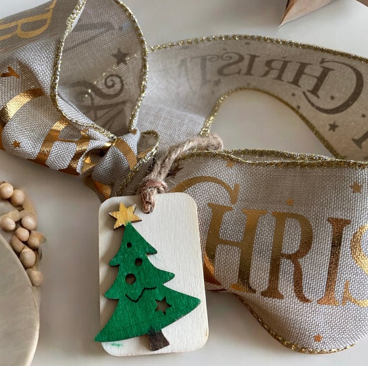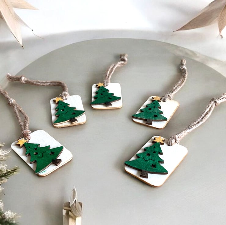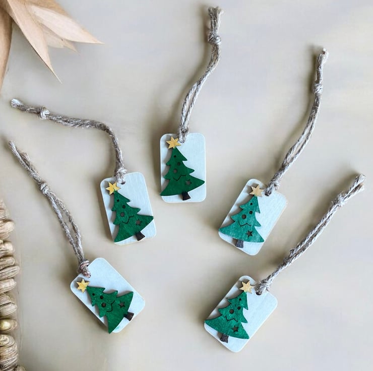 Set of 5 wooden gift tags each tag has a laser engraved hand painted Christmas Tree design. Made from natural wood for a warm, rustic feel and include twine for easy tying onto gifts or decorations