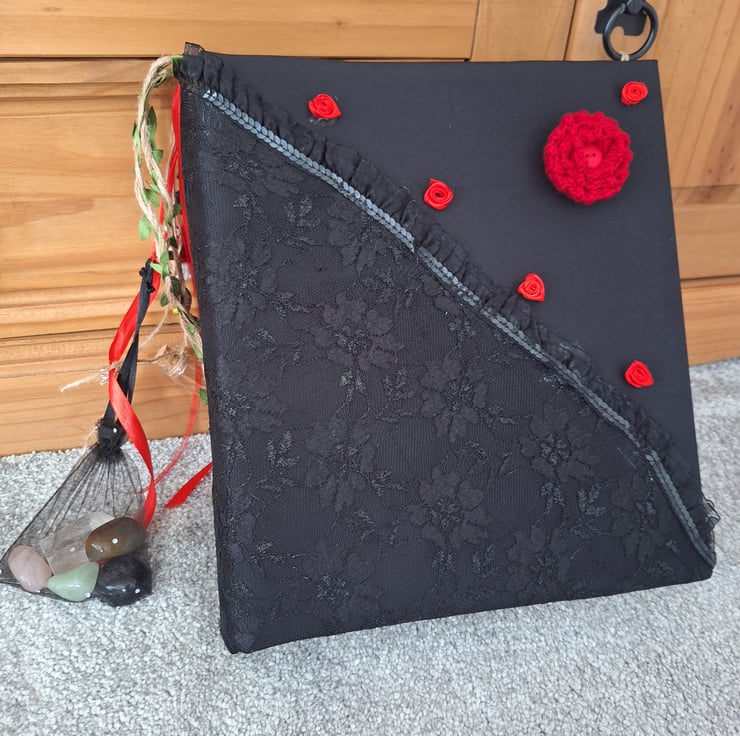The folder is a 2 ring, A4 size, brilliant for building up your grimoire or book of shadows. The inside cover is adorned with lace and the inside cover can be decorated with your own art work.