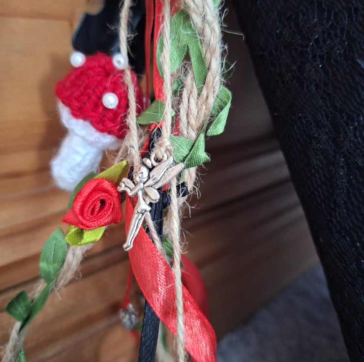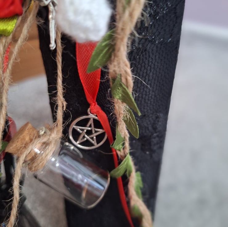A hand crafted book of shadows or Grimoire folder covered with taffeta and lace and embellished with a hand Knitted toadstool and rose. The spine is embellished with a pentagram, fairy and pine cone charm and also an organza bag for holding crystals (not included). Included also is a bottle for holding moon or sun water or perhaps a charm or protection spell.