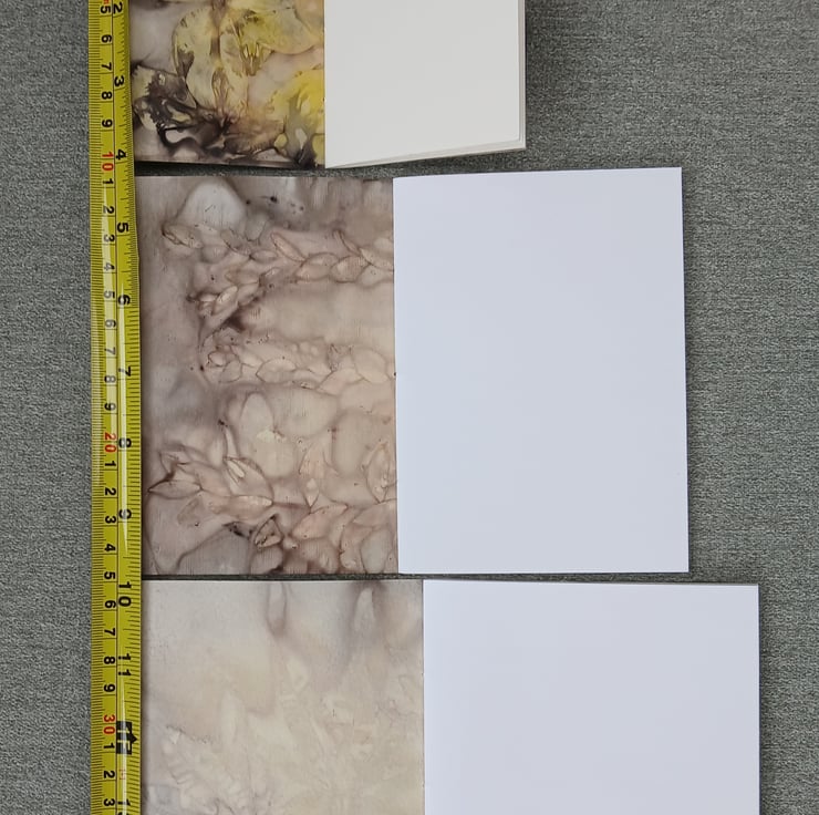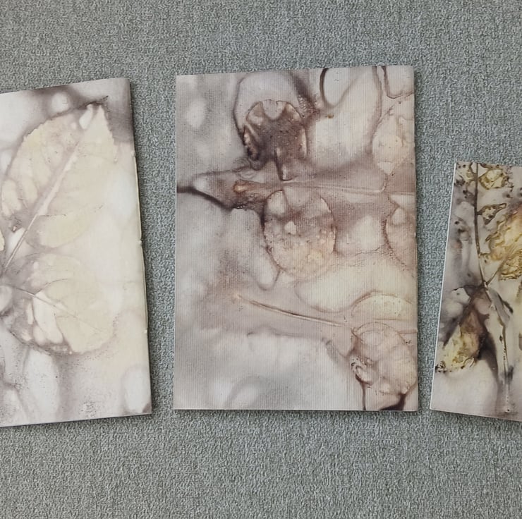 This listing is for a set of 3 pamphlet stitched notebooks with original eco printed covers. Eco printing is a technique which uses heat to extract the pigments from leaves, flowers and plants leaving imprints on the paper. Each print is unique. These notebooks each contain at least 10 pages of paper (at least 110gsm) and the eco printed covers are made from either watercolour paper, mixed media paper or acrylic paper. The smallest notebook measures approximately 7cm x 10cm and the largest approximately 11.5cm x 14cm. The photos show the front covers and the back covers and the final 2 photos (where I have a tape measure holding the books open) show the prints on the inside and also the approximate size of the notebooks. I have tried to photograph the notebooks so that the colours are as accurate as possible but please be aware that colours can look slightly different and may vary on different screens.