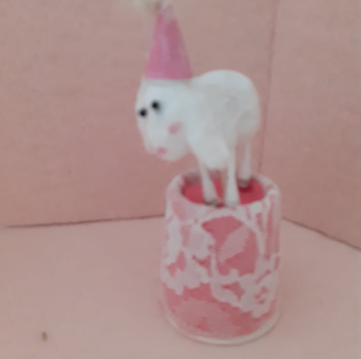 Margo, a little sheep who is ready to party, her eyes are quite beady,