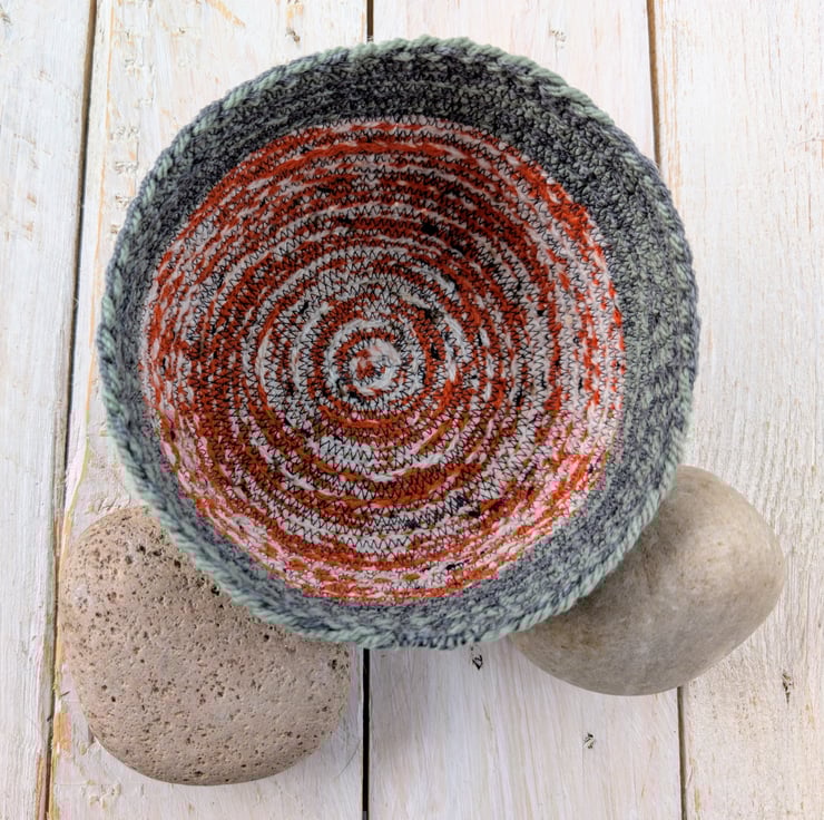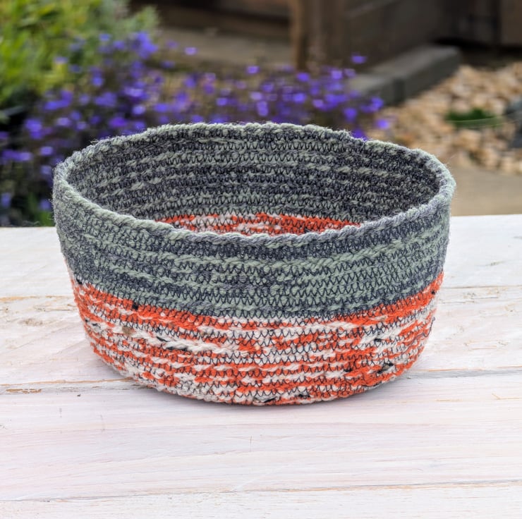 Handmade from wool and then stitched to form the basket shape.