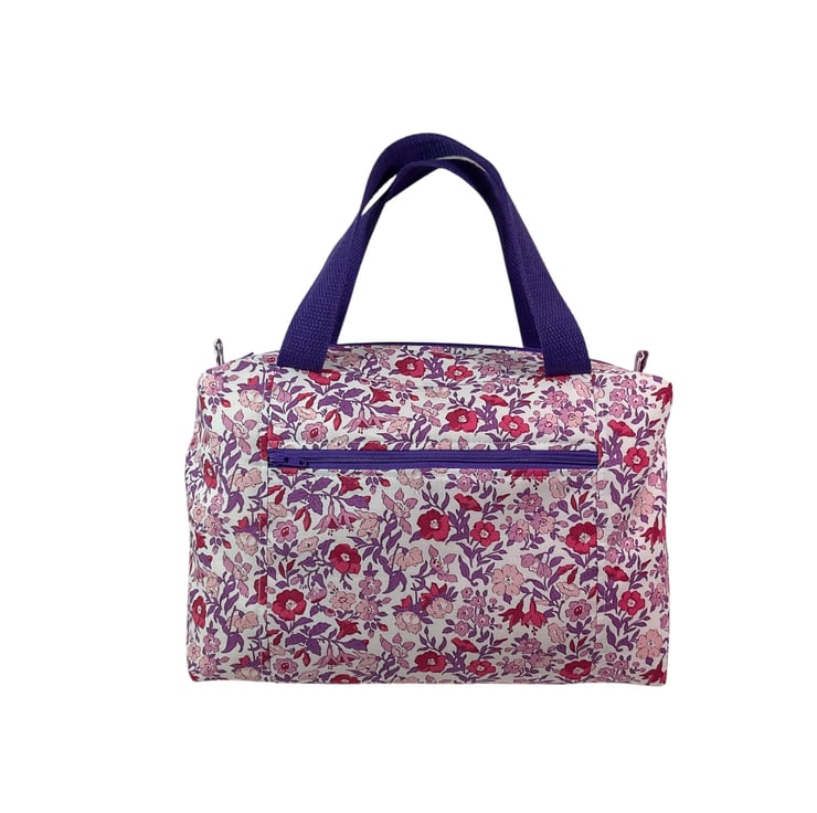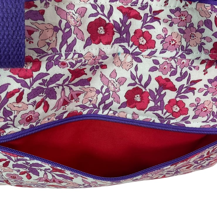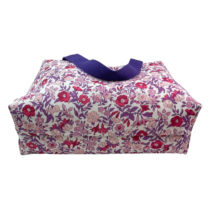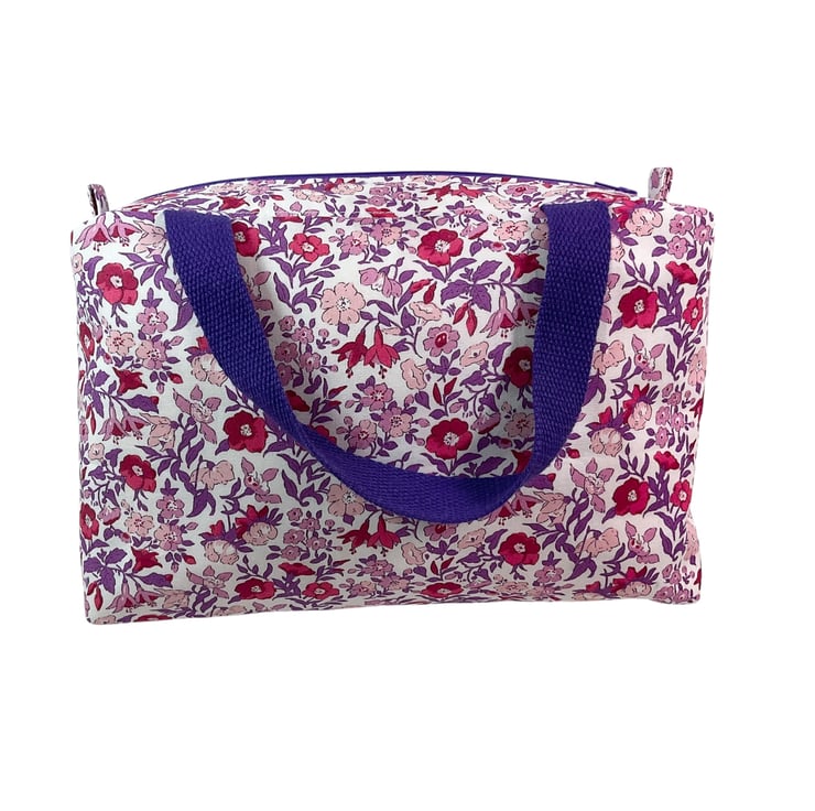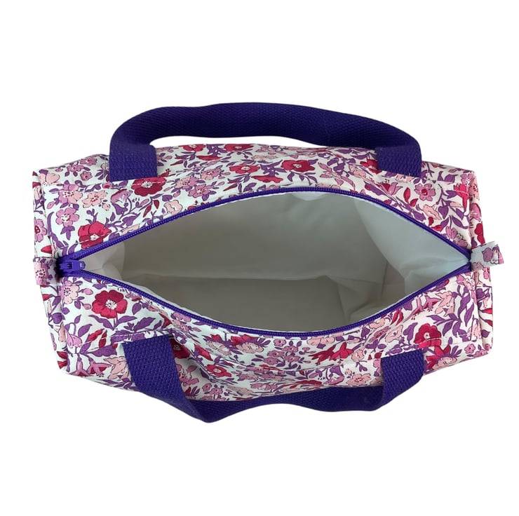 This large boxed bag is made from Liberty’s Lasenby cotton fabric, a quality hard wearing fabric from their “mamie flower” print, the focus of this toiletries bag is its pretty purple and pink floral print on a white background. The bag is a large sized washbag that would work equally well as a very large cosmetics bag, or for many other uses. I have filled the bag with full size toiletries and there is still plenty of space left.