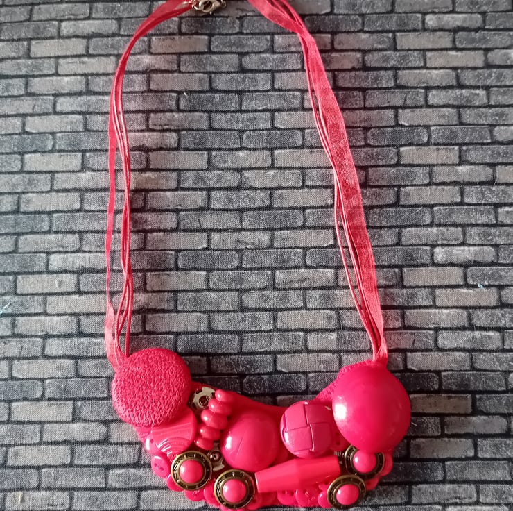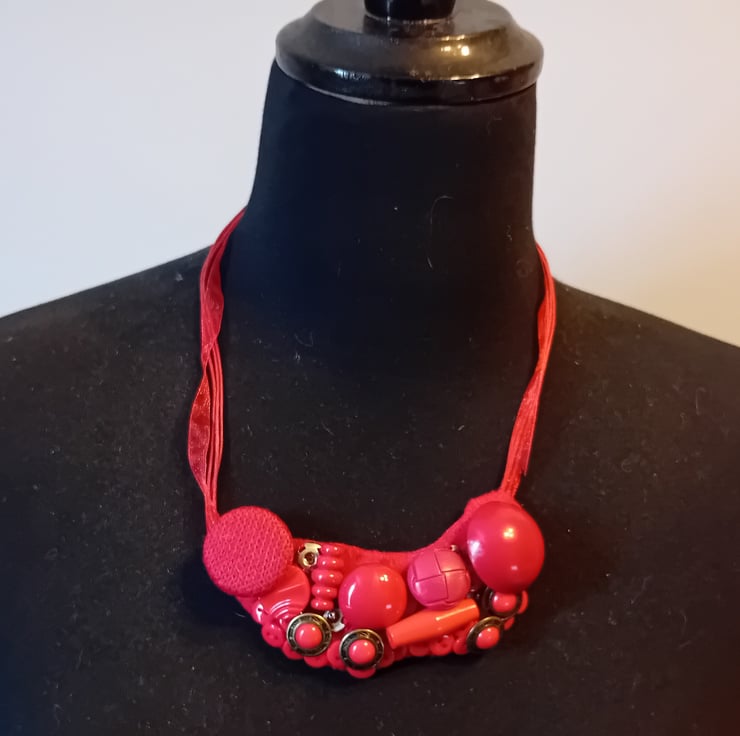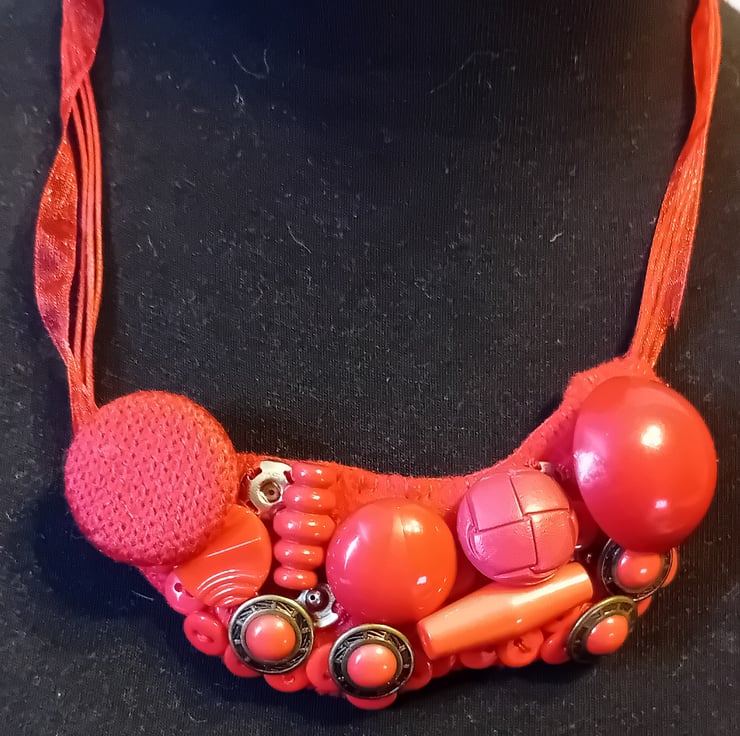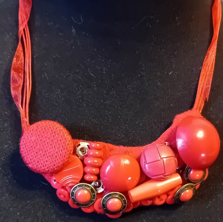 A celebration of all things red! This striking necklace is made from a mix of found and vintage buttons in various styles, shapes, and shades – all hand-sewn onto a fabric panel for maximum impact.