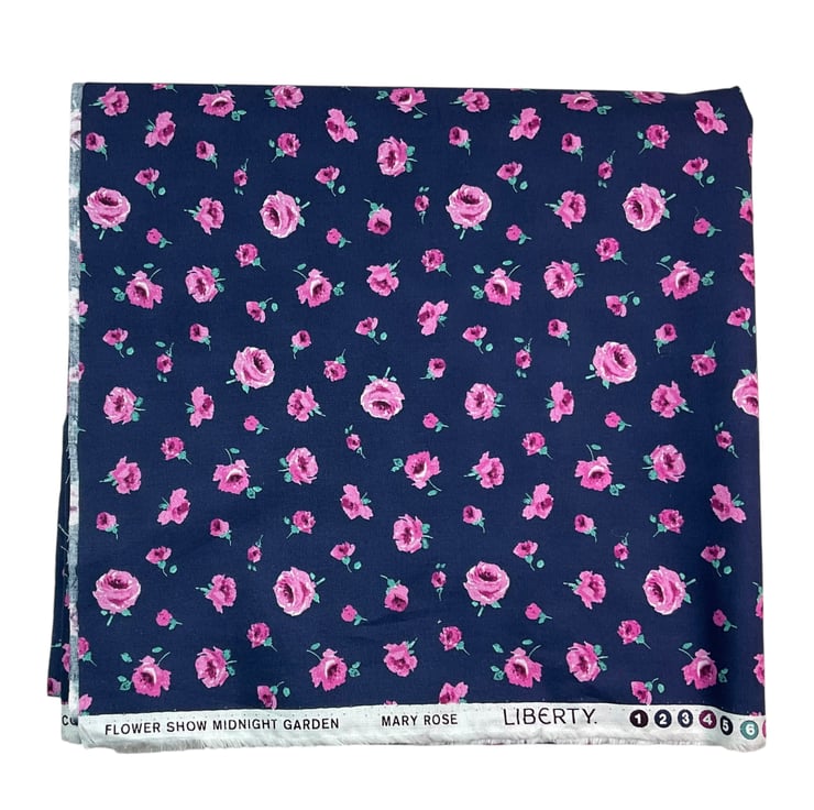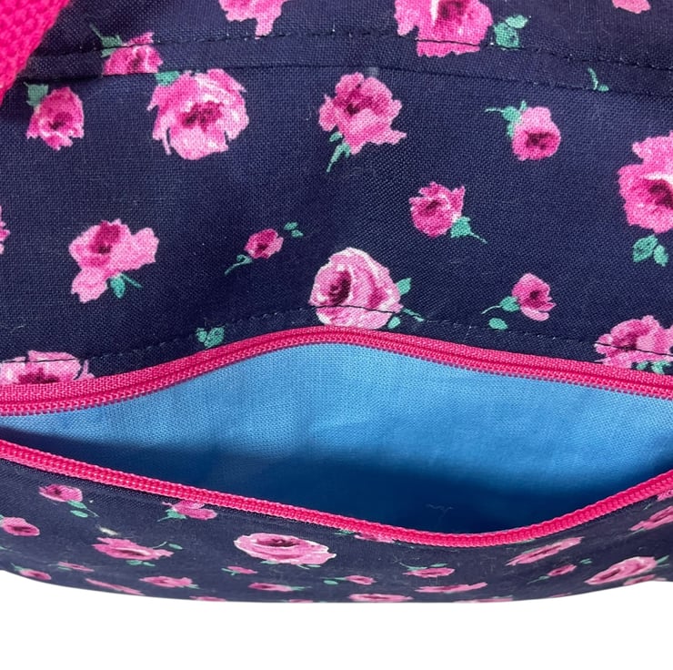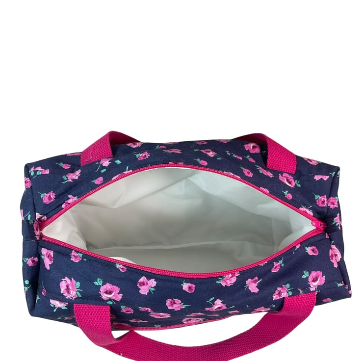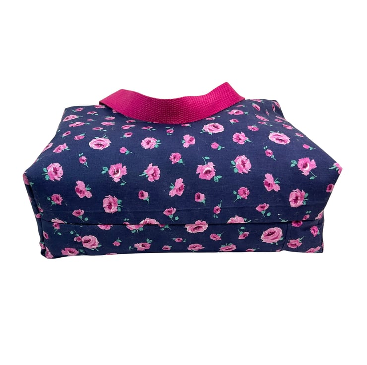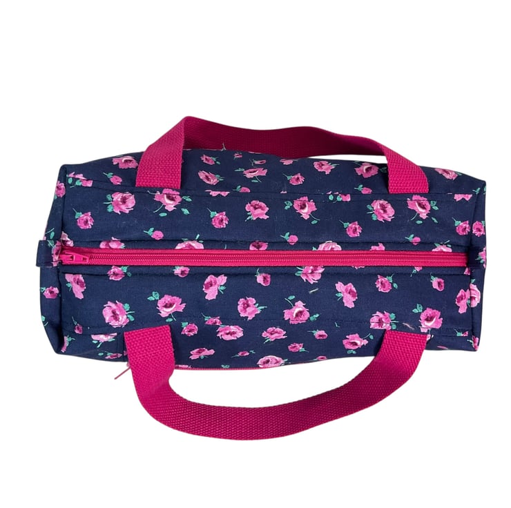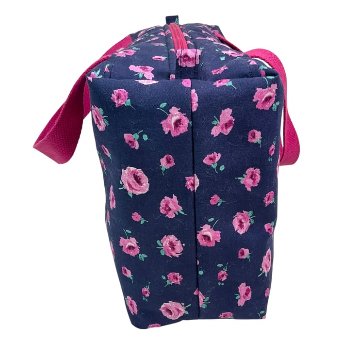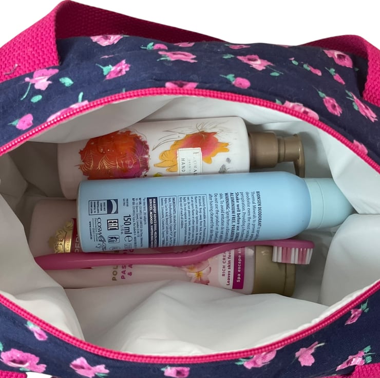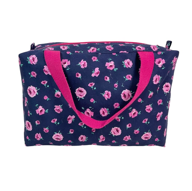 This large boxed bag is made from Liberty’s Lasenby cotton fabric, a quality hard wearing fabric this print is “Mary Rose” print, the focus of this toiletries bag is its pretty cerise pink rose floral print on a navy background. The bag is a large sized washbag that would work equally well as a very large cosmetics bag, or for many other uses. I have filled the bag with full size toiletries and there is still plenty of space left.
