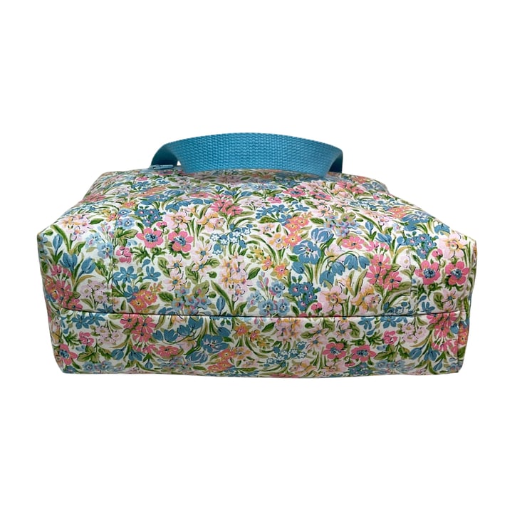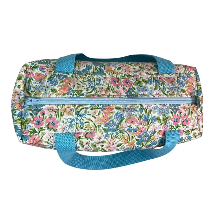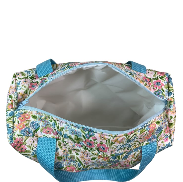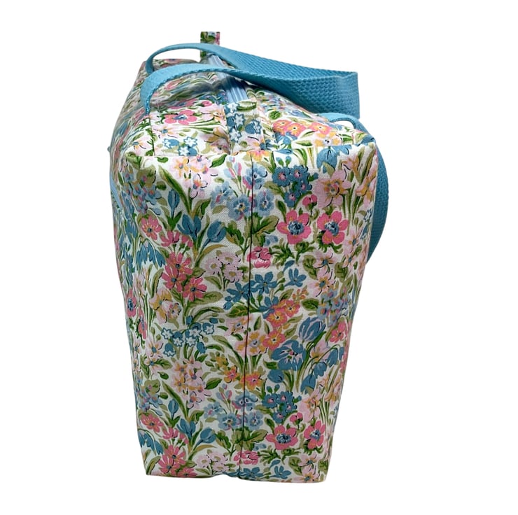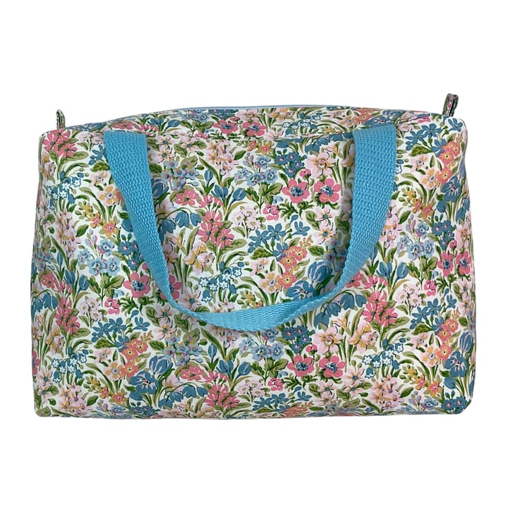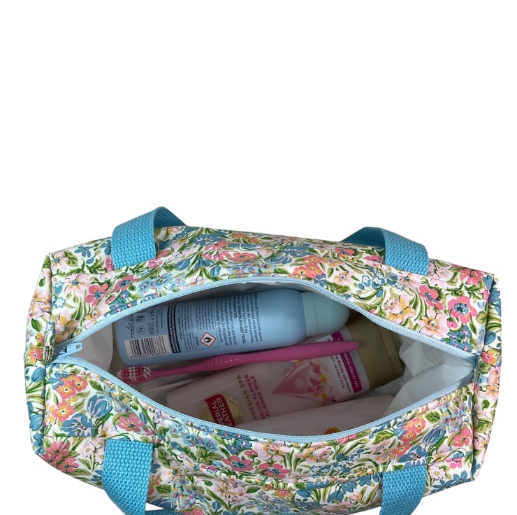 This large boxed bag is made from Liberty’s Lasenby cotton fabric, a quality hard wearing fabric this print is “ Kew Blooms” , the focus of this toiletries bag is its pretty small pastel coloured floral print on an off white background. The bag is a large sized washbag that would work equally well as a very large cosmetics bag, or for many other uses. I have filled the bag with full size toiletries and there is still plenty of space left.
