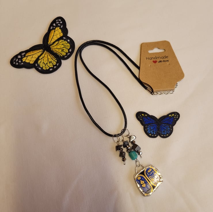 All my items are made from vintage and second-hand materials, including tea towels, books, scrap yarn and broken jewellery. I buy all my materials on second hand apps such as Vinted and eBay, plus in second hand stores including charity shops.
