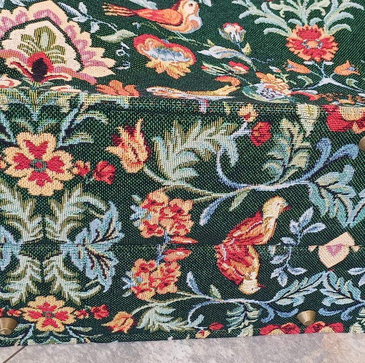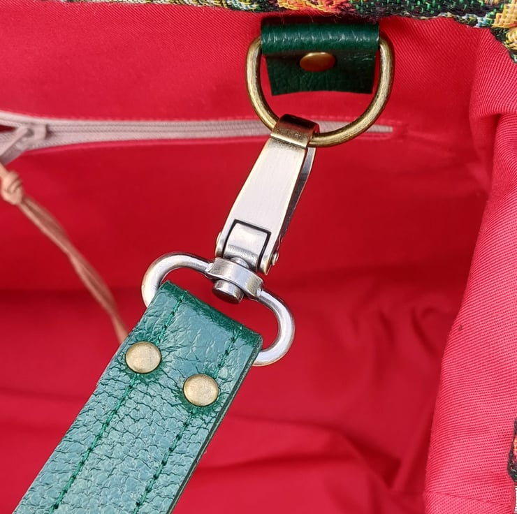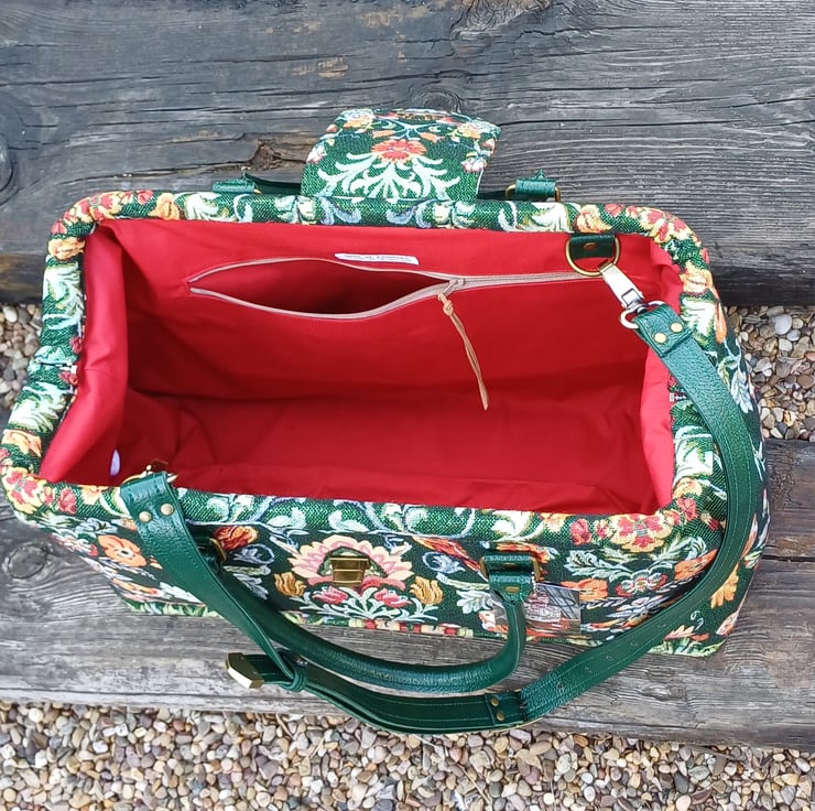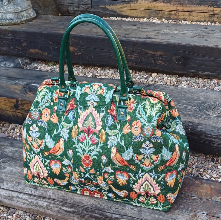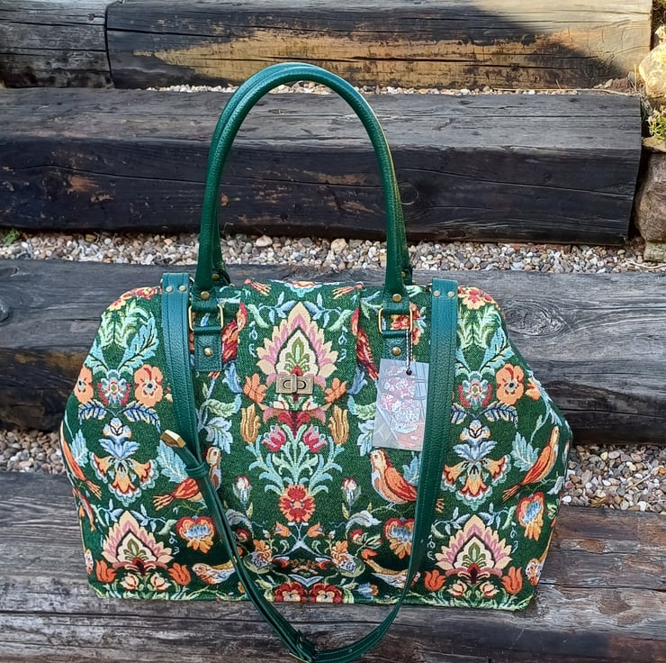 Made from a green William Morris style tapestry fabric, ( NOT actually William Morris fabric ) This large weekender travel bag features a semi solid bag base with bag feet, green handcrafted real leather carry handles and detachable shoulder strap, and a twist bag lock on the front. This bag has an internal spring loaded bag frame therefore it " pops " open and " snaps " shut, it is made with lots of heavy duty interfacing and bag foam to give the bag structure and durability, and it will stand upright on it's own.