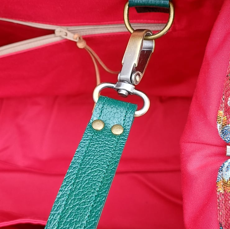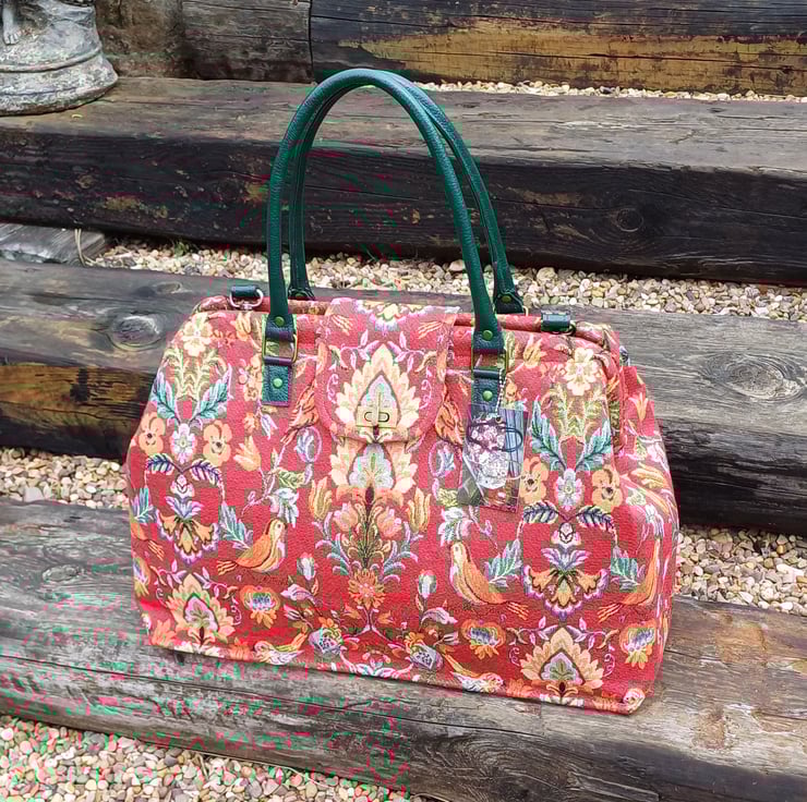 Made from a red William Morris style tapestry fabric, ( NOT actually William Morris fabric ) This large weekender travel bag features a semi solid bag base with bag feet, green handcrafted real leather carry handles and detachable shoulder strap, and a twist bag lock on the front. This bag has an internal spring loaded bag frame therefore it " pops " open and " snaps " shut, it is made with lots of heavy duty interfacing and bag foam to give the bag structure and durability, and it will stand upright on it's own.