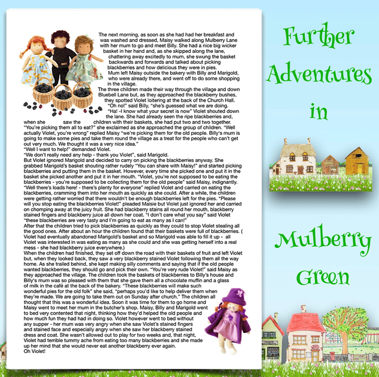 There are other children in Maisy’s class at school - Violet, Billy with his pet rabbit, Amber, Tilly, Rosie and her kittens, Amelia, Ruby, Marigold, Bobby with Max the dog, and the twins Oliver and Olivia, who have a puppy called Oscar. The dolls are all 26cm tall and baby Daisy is 16cm. Maisy and Mo love nothing more than having adventures with their friends. You can read about their adventures on my Facebook and Instagram pages - Maisy Muffin Rag Dolls and on my Mulberry Green Pinterest boards.