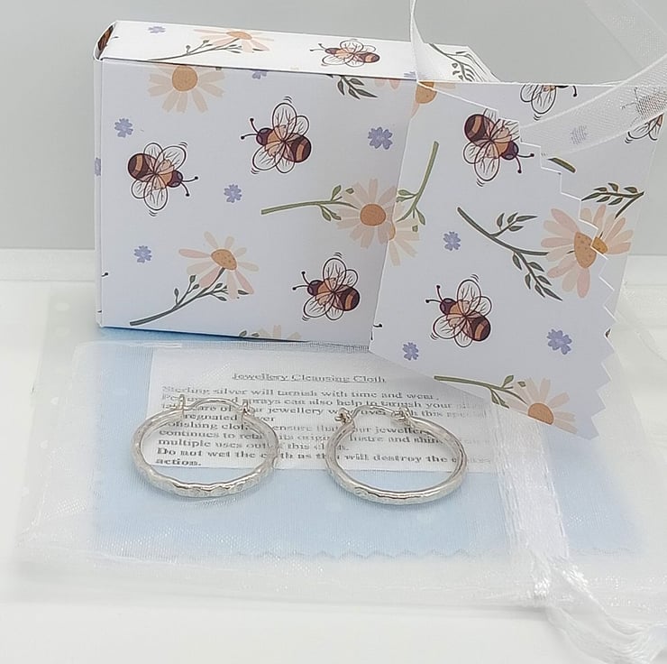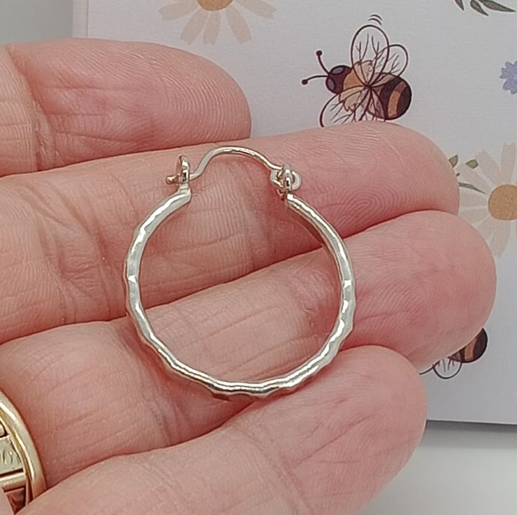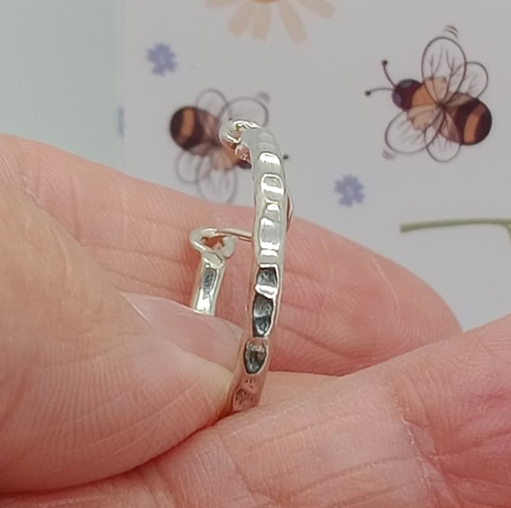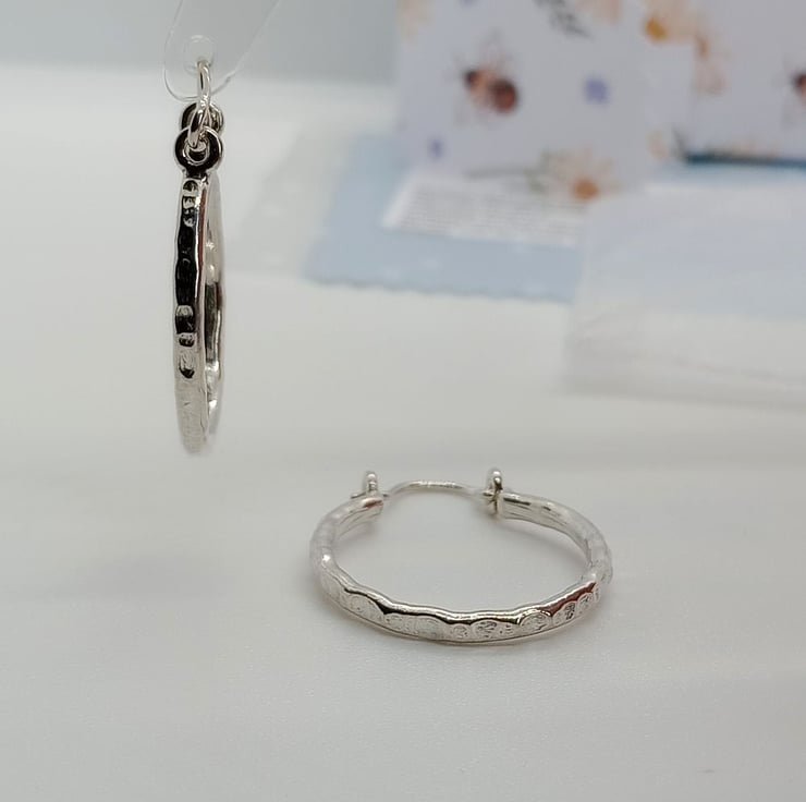 Solid sterling silver Hoop earrings with a dashed pattern, handmade from recycled sterling silver.