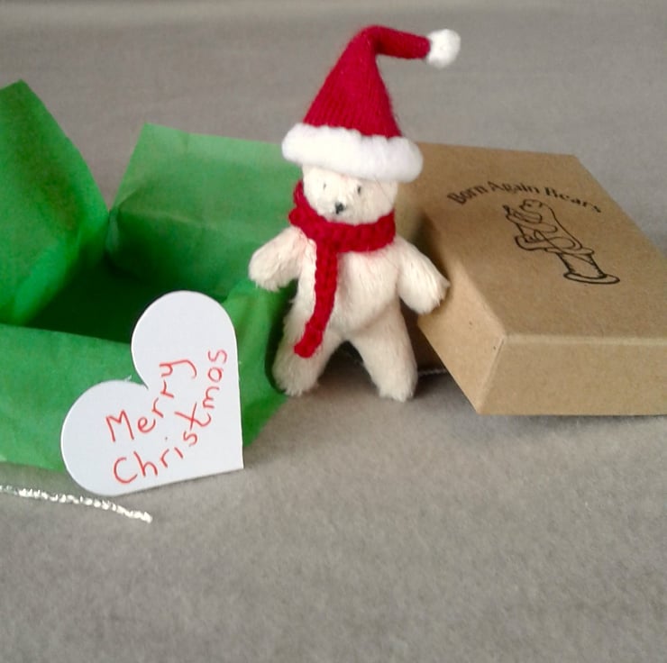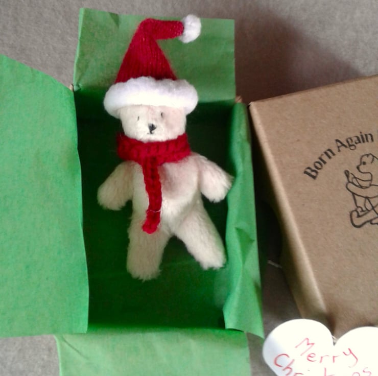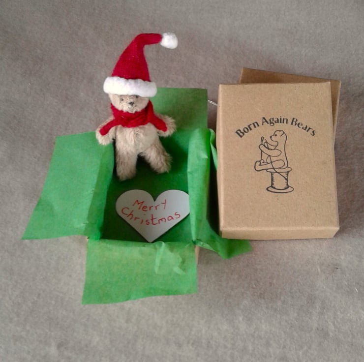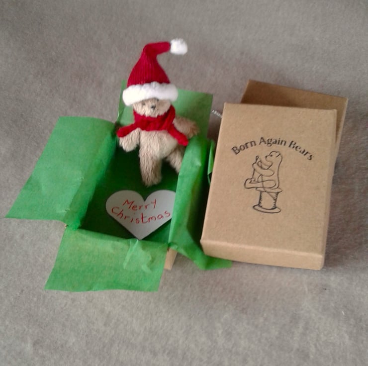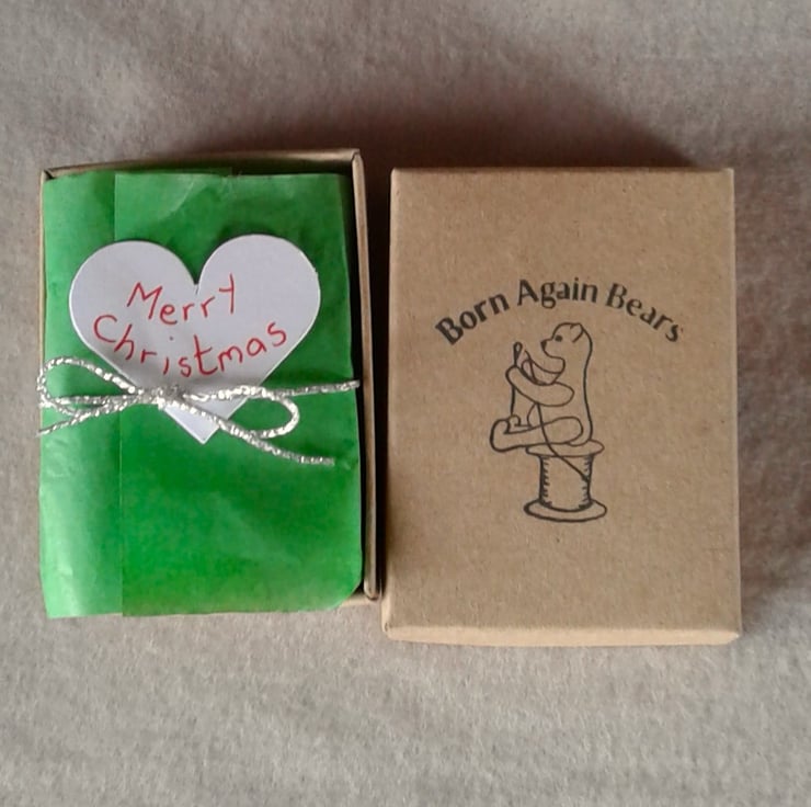 I have stamped my Born Again Bears logo on the box and lined each with green tissue paper, added a silver bow and a heart saying Merry Christmas.