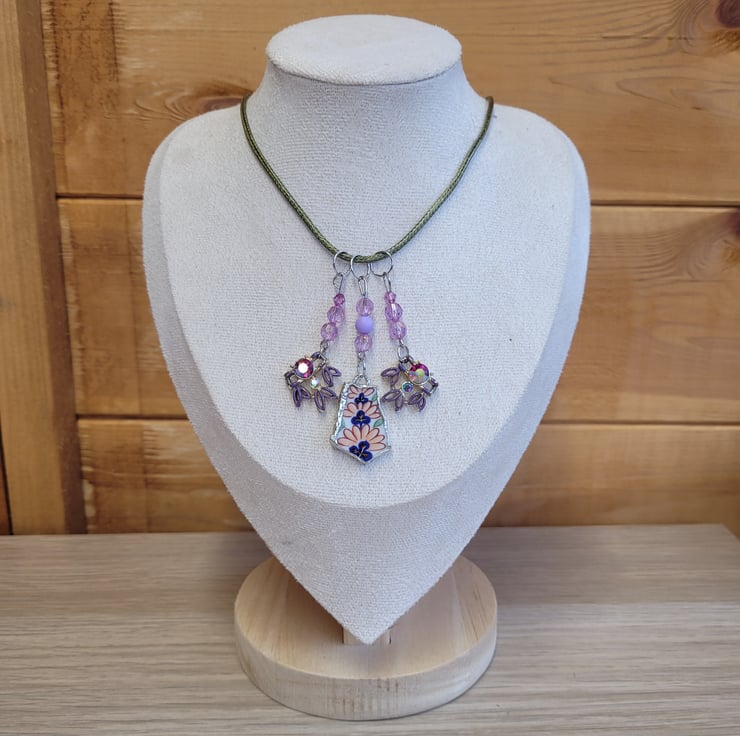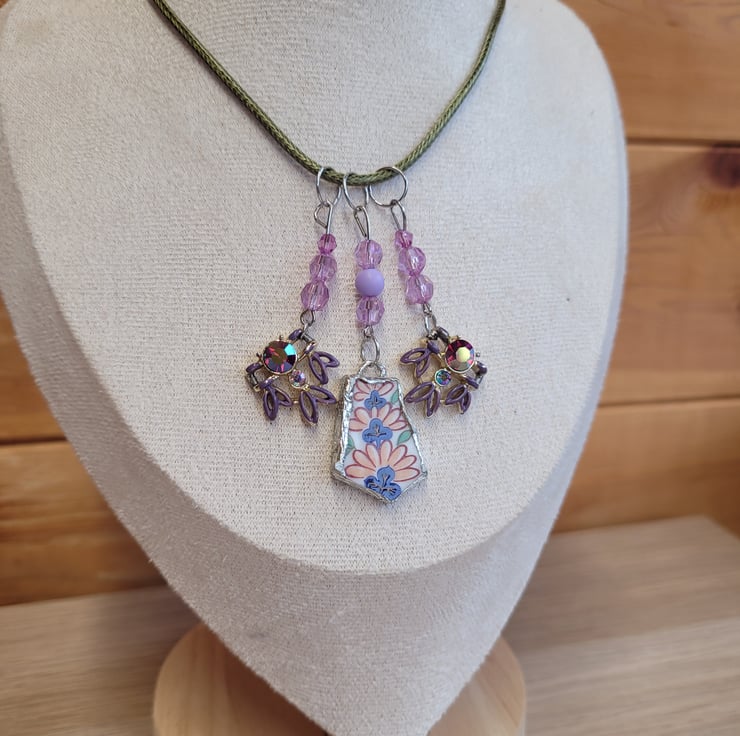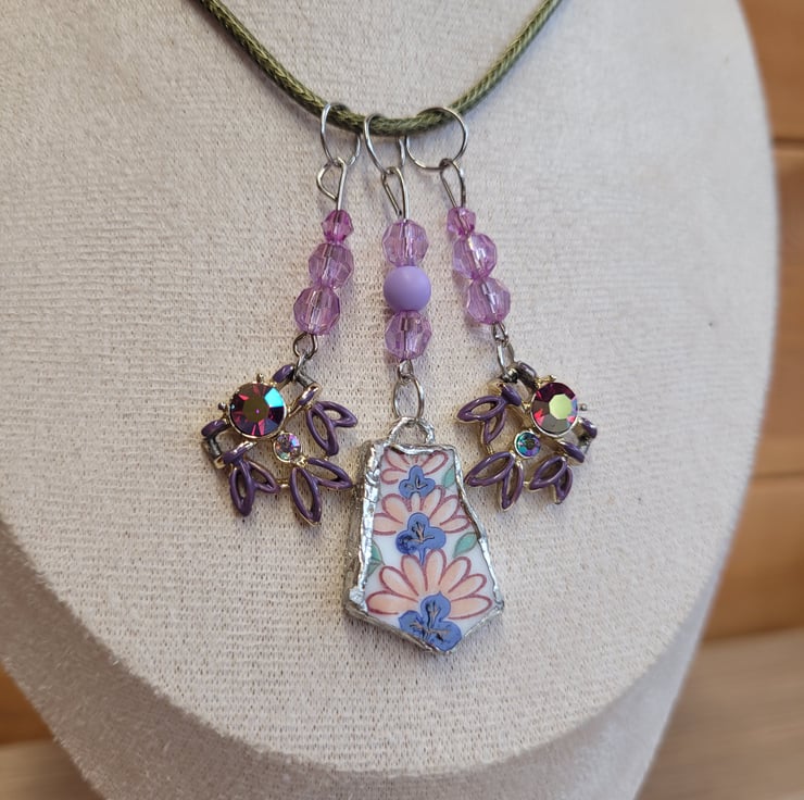 Upcycled Japanese Floral Ceramic Plate Necklace with Green Cord.