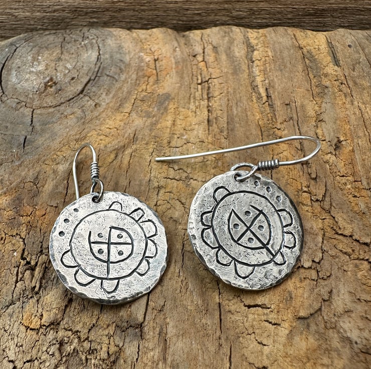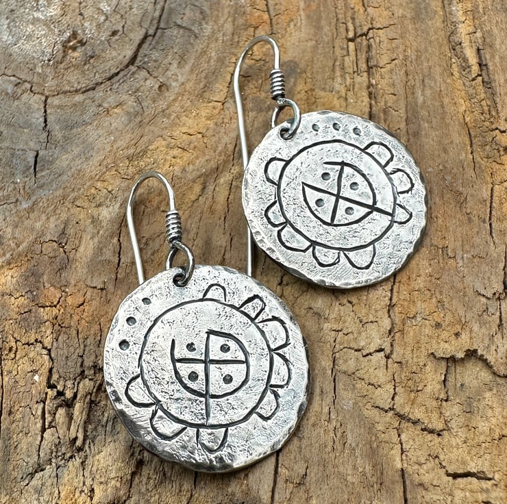 Inspired by ancient rock carvings these rock flower earrings are made in sterling silver and measure apron 16mm across with handmade sterling silver hooks.