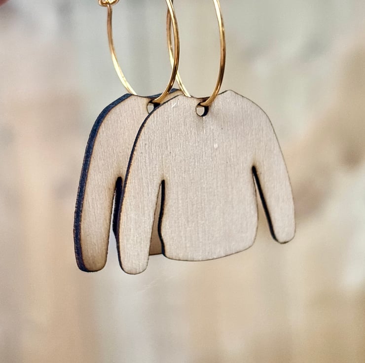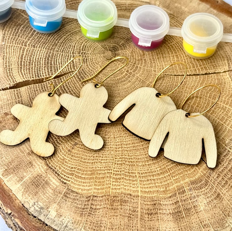 2 pairs of wooden earring blanks laser cut on 3 mm plywood - gingerbread man and Christmas jumper.