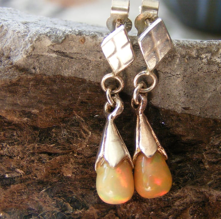 The opals have a creamy base colour and feature bright red, green and orange flashes when moved in the light. The opals drop elegantly from sterling silver fluted cups which hang from dimond shaped, textured ear studs.