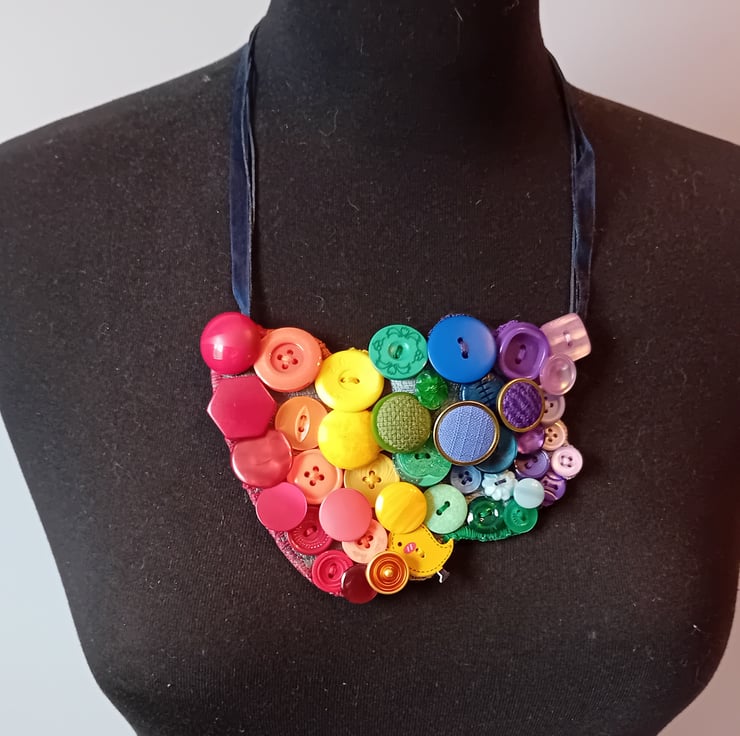 From deep reds to sunny yellows and cool blues, every button has been chosen for its charm and shade, creating a piece that’s both playful and totally unique. The panel is attached to a soft lace necklace, making it comfortable and easy to wear.