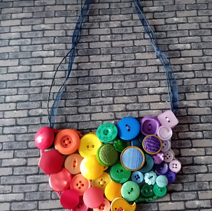 Bright, bold, and full of joy! This eye-catching necklace is made from a collection of found and vintage buttons in vibrant rainbow colours, each carefully sewn onto a upcycled leather panel.