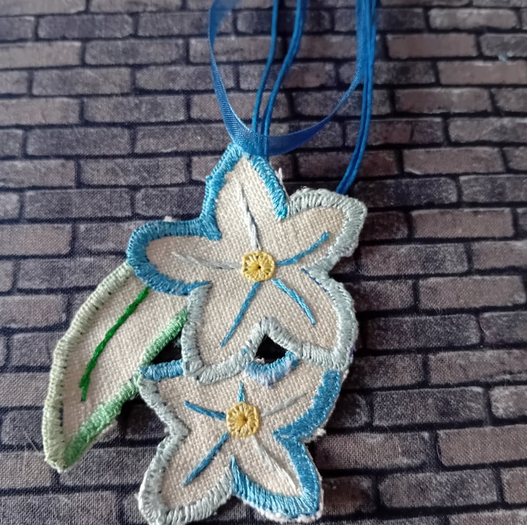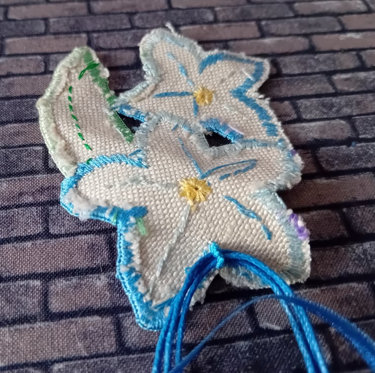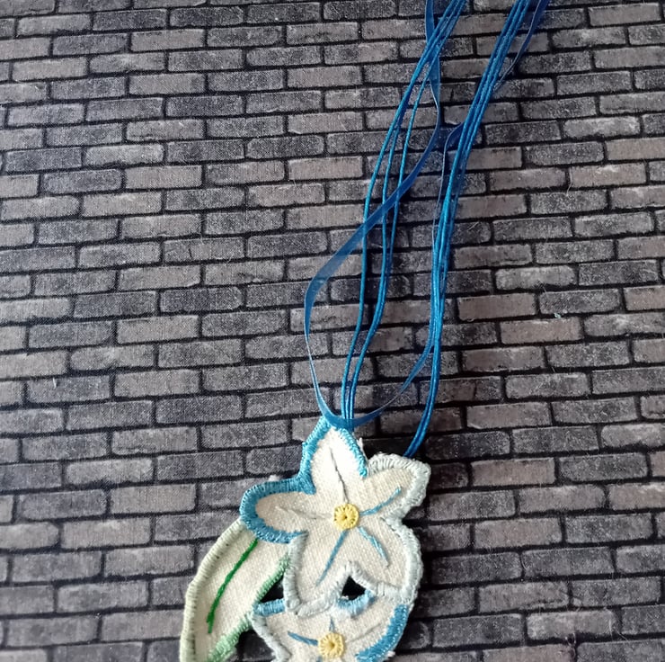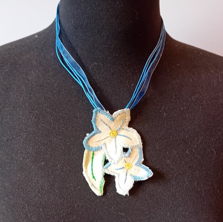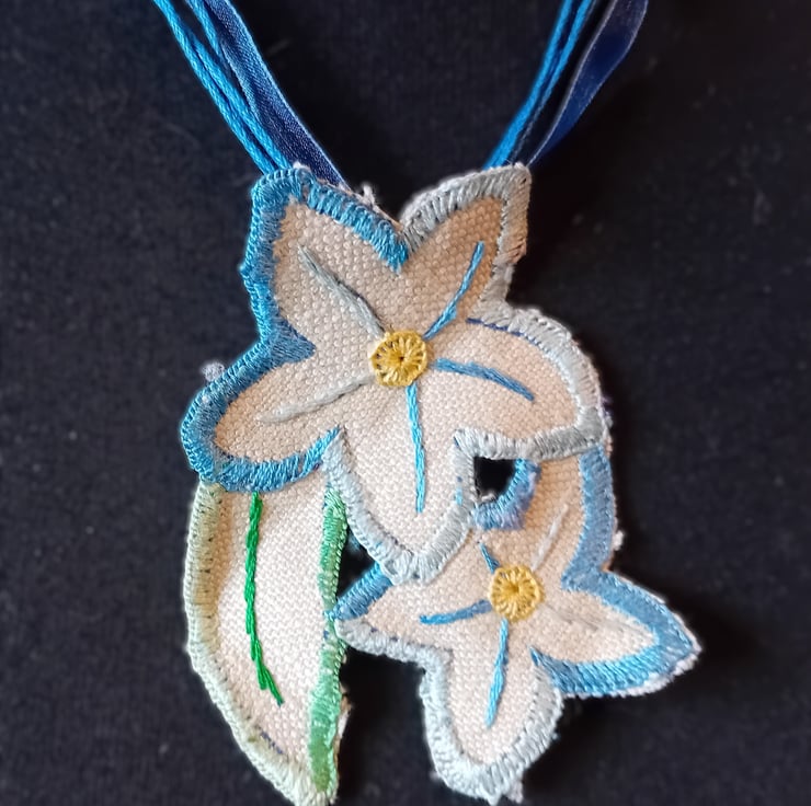 This one-of-a-kind necklace has been upcycled from a vintage tablecloth, showcasing delicate cream flowers outlined in soft blue embroidery. Each floral detail has been carefully preserved and hand-stitched onto a panel that captures the charm of vintage textiles.