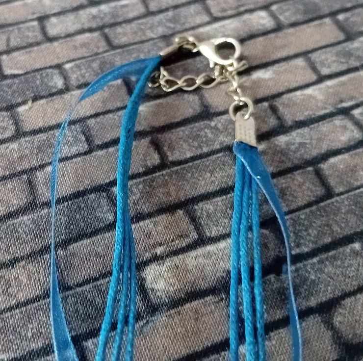 The panel is attached to a matching blue necklace cord, creating a gentle, coordinated look that’s full of subtle beauty and nostalgic character.