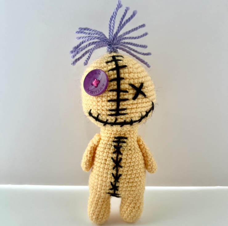 This charming voodoo doll features iconic button eyes and artfully stitched details, giving it a delightfully spooky yet undeniably adorable appeal.