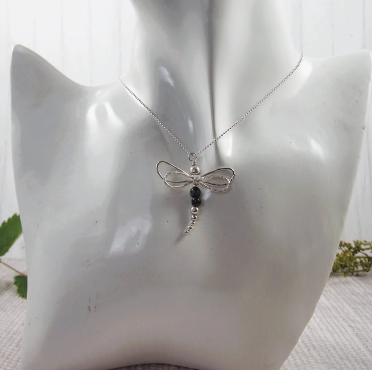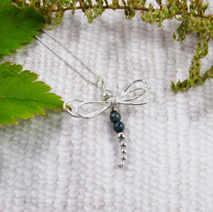 Silver dragonfly necklace with chrysocolla gemstones on 18 inch sterling silver chain.