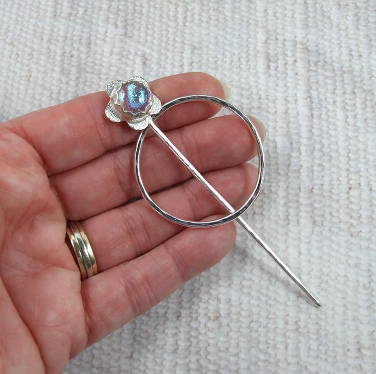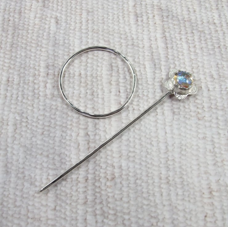 I have made the ring from 2mm solid Sterling Silver wire with hammered texture. The pin is made from 2mm wire, shaped with a rounded blunt point at one end. At the other I have created a flower shape using silver sheet and wire and set with a pretty shimmery dichroic glass cabachon.