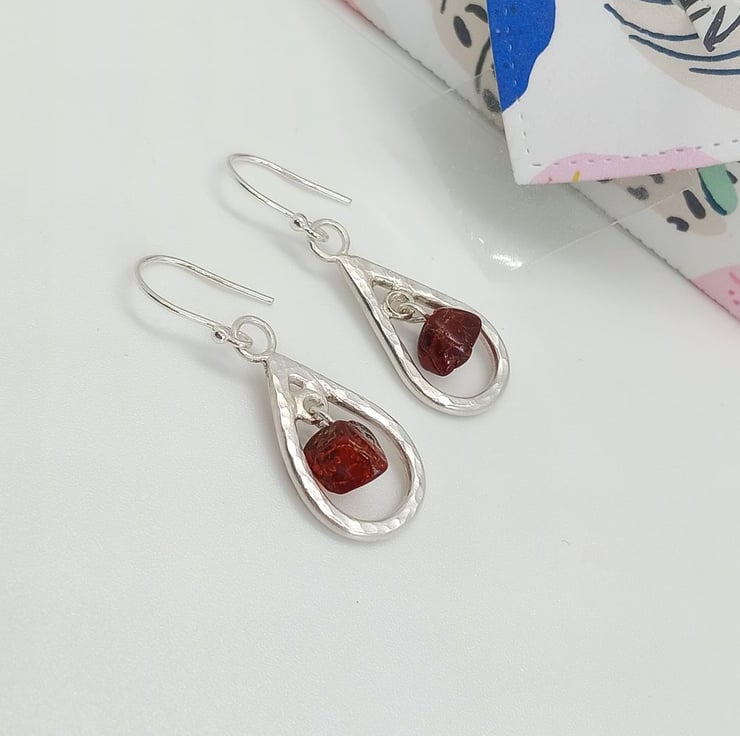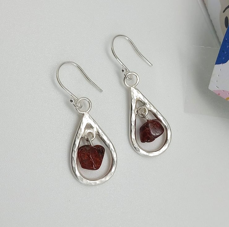 Hammered outline sterling silver raindrop earrings with suspended cognac amber tumbled chip stones.
