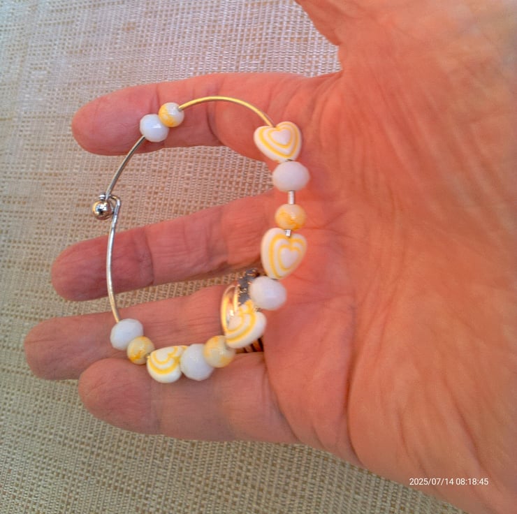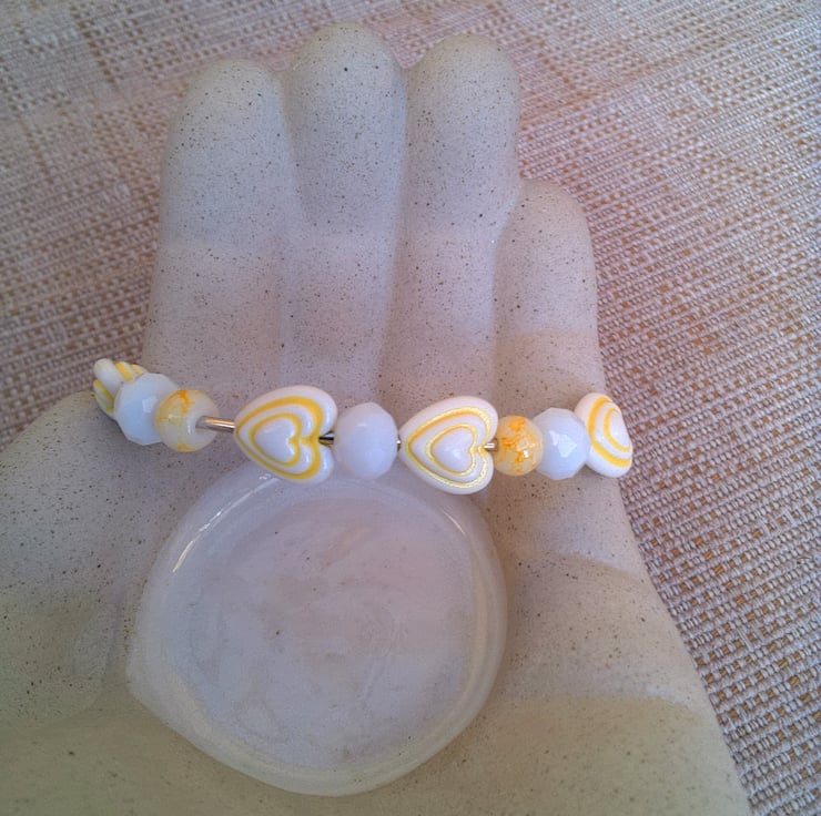 This cute rigid bangle with yellow hearts and white faceted beads bracelet look great with any casual, beach or everyday outfit. It would also make a lovely gift for someone special, or a treat for yourself. The bracelet is made using 10 mm x 10 mm white heat beads with yellow detailing, 6 mm white and yellow mottled beads and 8 mm x 6 mm faceted white beads on a rigid silver plated bracelet base. It is 18.5 cm in circumference and fastens with a ball and hook clasp. The bracelet will be dispatched wrapped in tissue paper in an organza bag and delivered to you via Royal Mail 1st class post.
