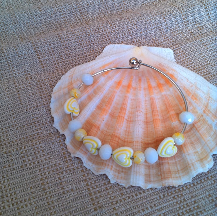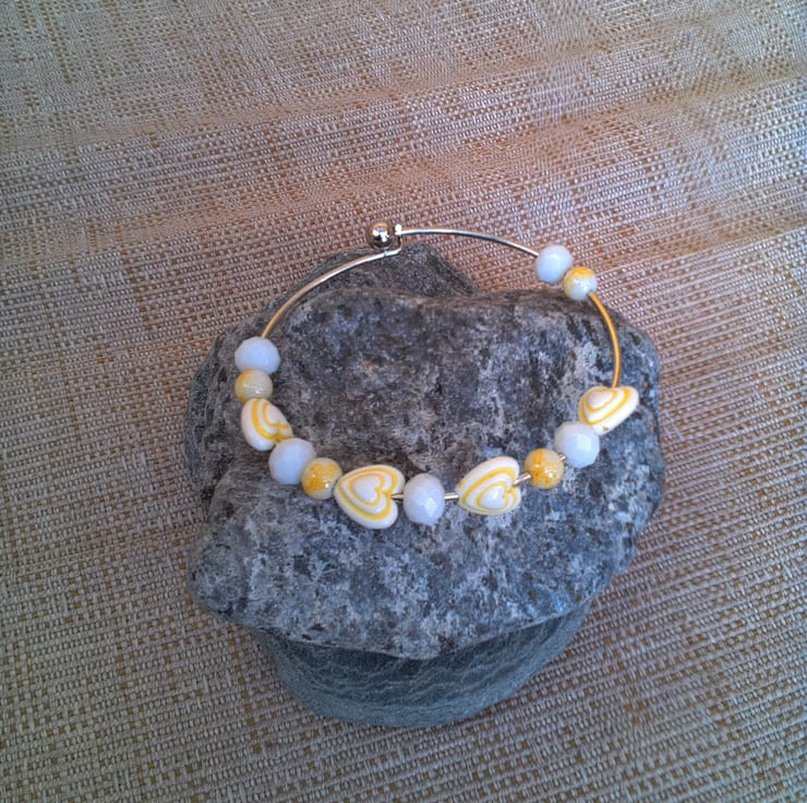 Rigid Bangle with Yellow Hearts and White Faceted Beads, Gift for Her, Bangle Birthday Gift, Anniversary Gift, Jewellery, Yellow Bangle, Rigid Bangle
