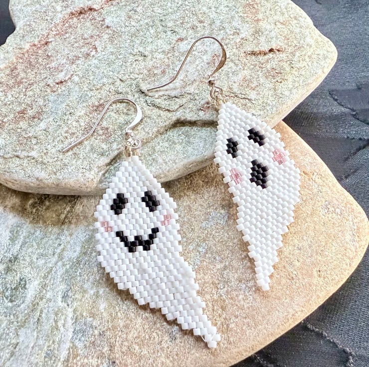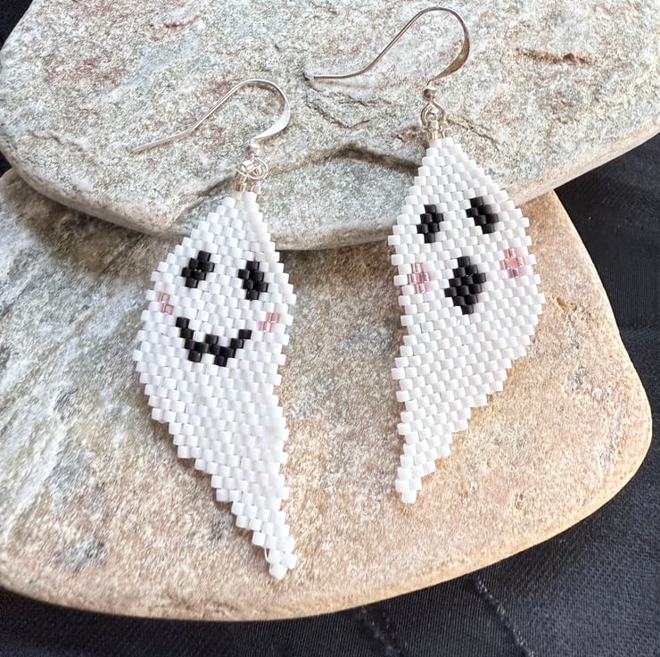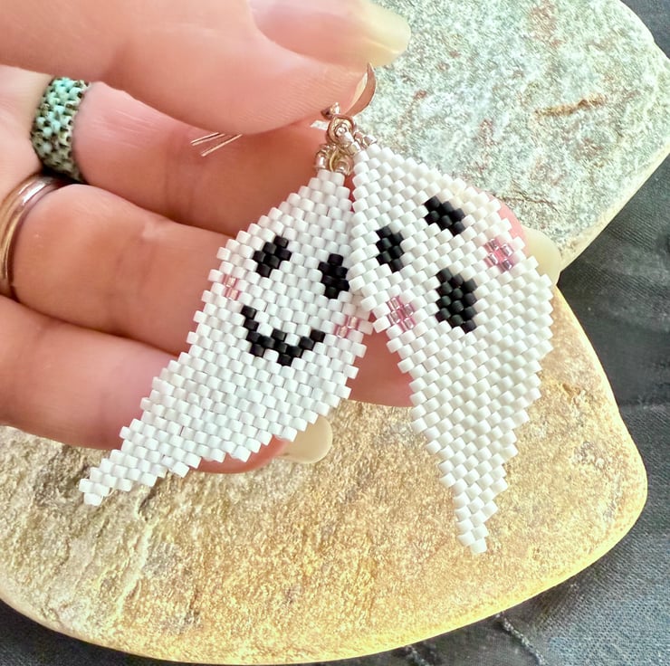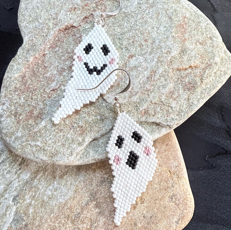 These cheeky ghosts are designed and handmade by me with tiny Miyuki seed beads. The bead are hand woven together into the image of a couple of spooky spectres and one ghost is giving you a wonky smile while the other is saying ‘Boo’ !