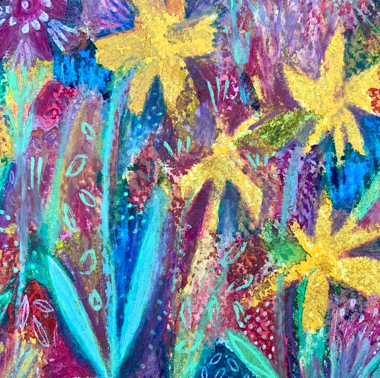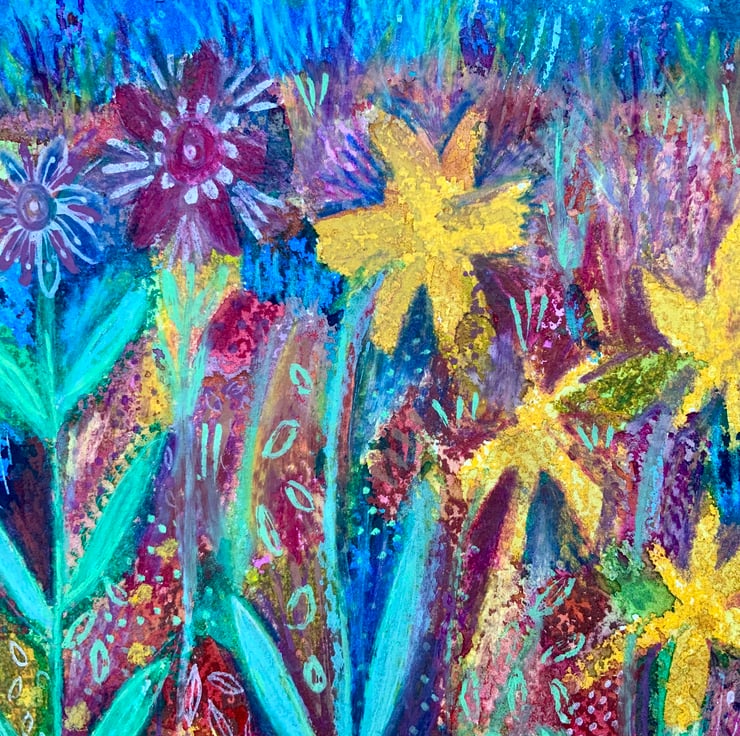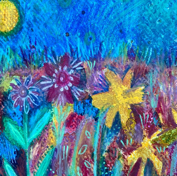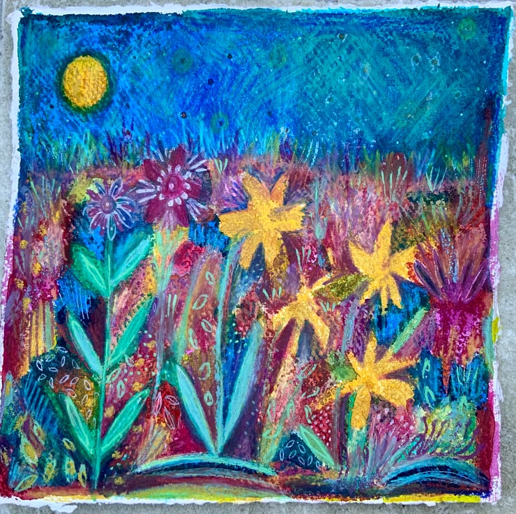 This is an oil pastel, watercolour and marker mixed media painting, painted on Indian Khadi watercolour paper. It measures approximately 21x21 cm and comes unmounted and unframed allowing you to choose a frame to your own style. It is a painting of an imaginary moon lit garden with lots of colourful plants and daffodils. Very colourful and bright painted in lots of reds, blues and yellows.