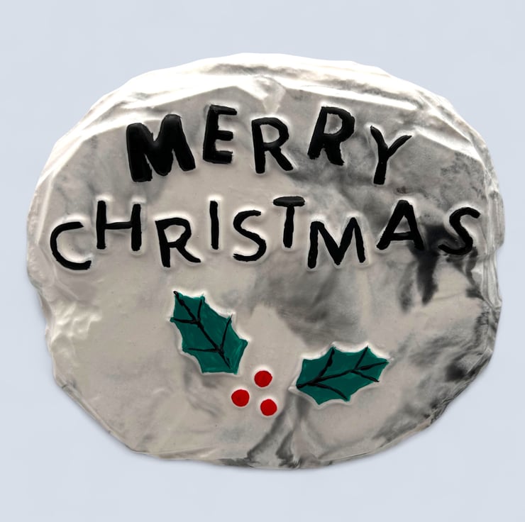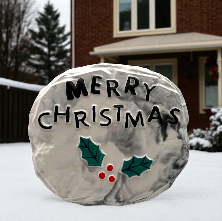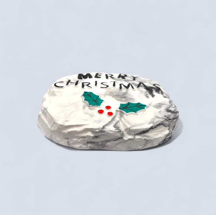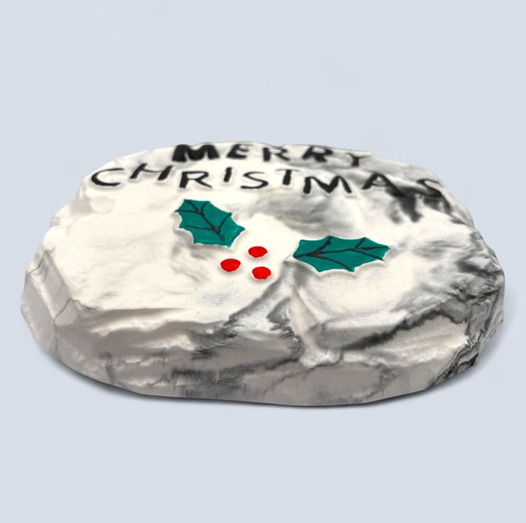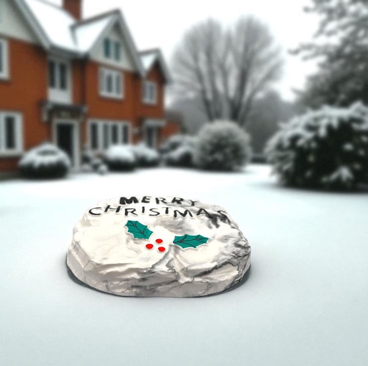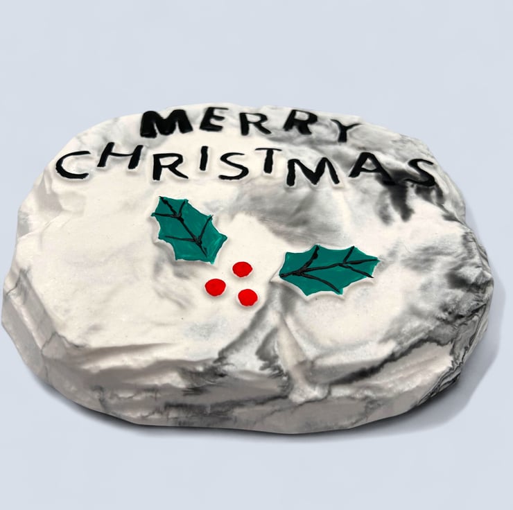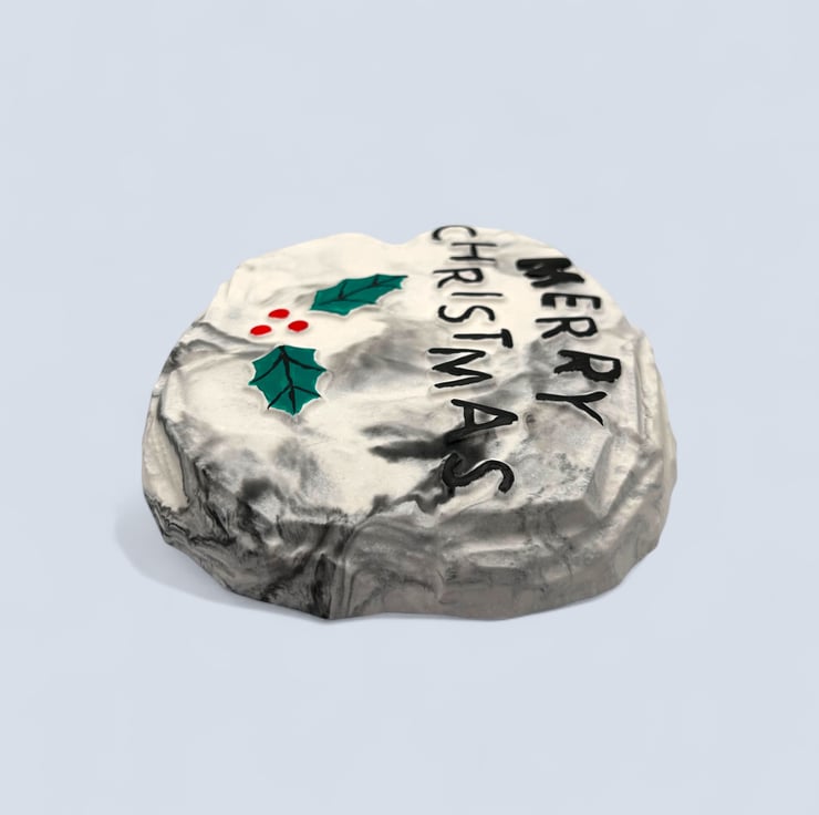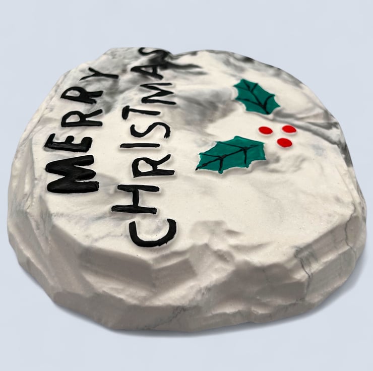 This handmade sign is designed to resemble a rock and features a striking black marbling pattern throughout. The raised lettering prominently displays the message, ‘Merry Christmas’, with a sprig of holly below which has been carefully hand-painted to enhance visibility.