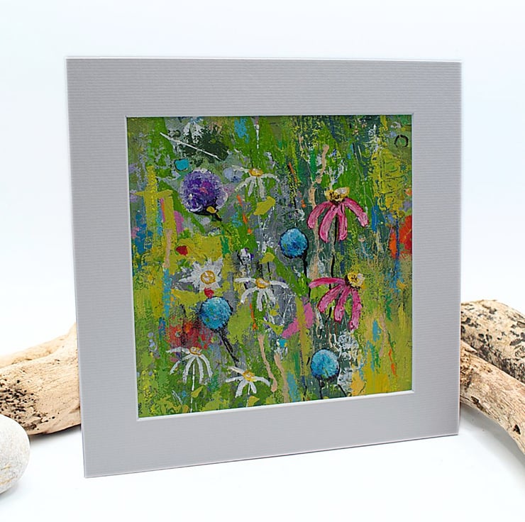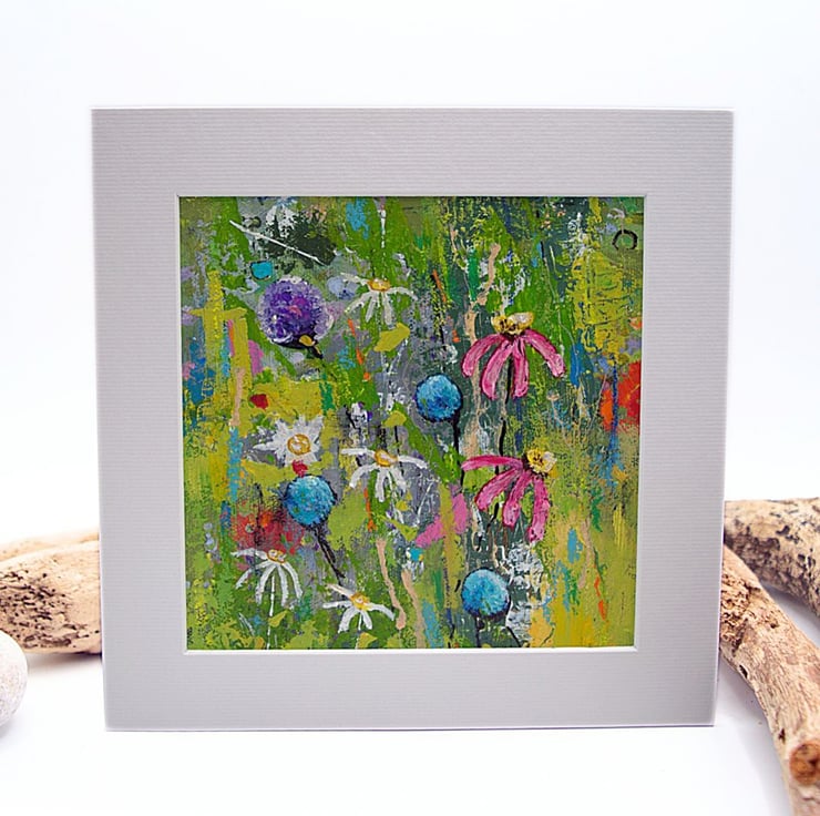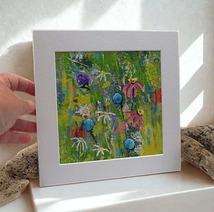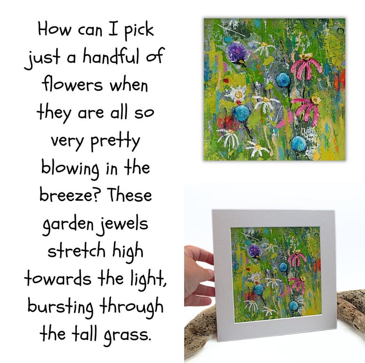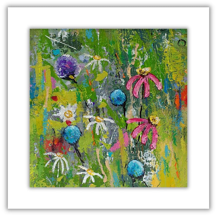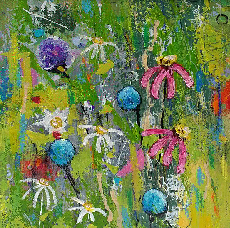 This is a small semi-abstract wildflower painting. It features a range of small wildflowers growing tall amongst the grasses. I have used professional-quality acrylics on sealed canvas. I've used flat brushes to paint the grass. The wildflowers have been painted using a range of finer brushes.