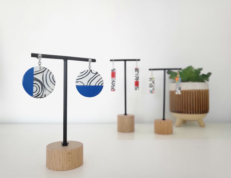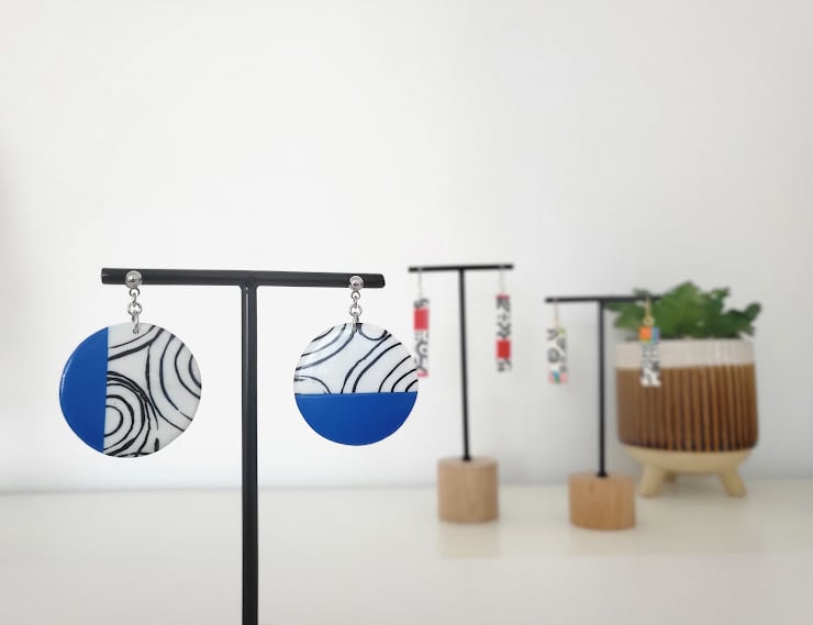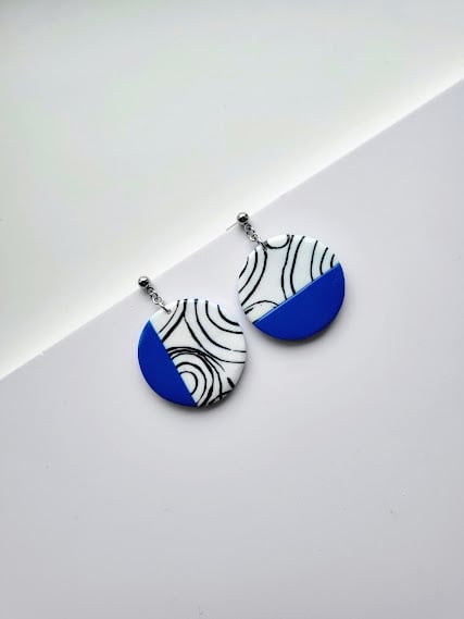 Make a vibrant statement with our "Azure Swirl Delight" earrings. These captivating circular earrings feature a striking modern design, half vibrant cobalt blue and half crisp white adorned with elegant black swirling patterns. Each earring is meticulously crafted to be lightweight and comfortable, ensuring you can wear them all day with ease. Perfect for adding a pop of colour and artistic flair to any outfit, from casual wear to sophisticated evening ensembles