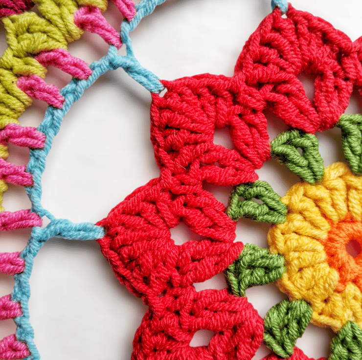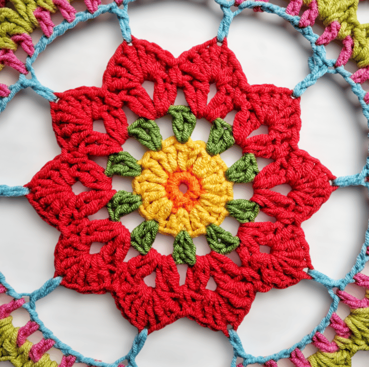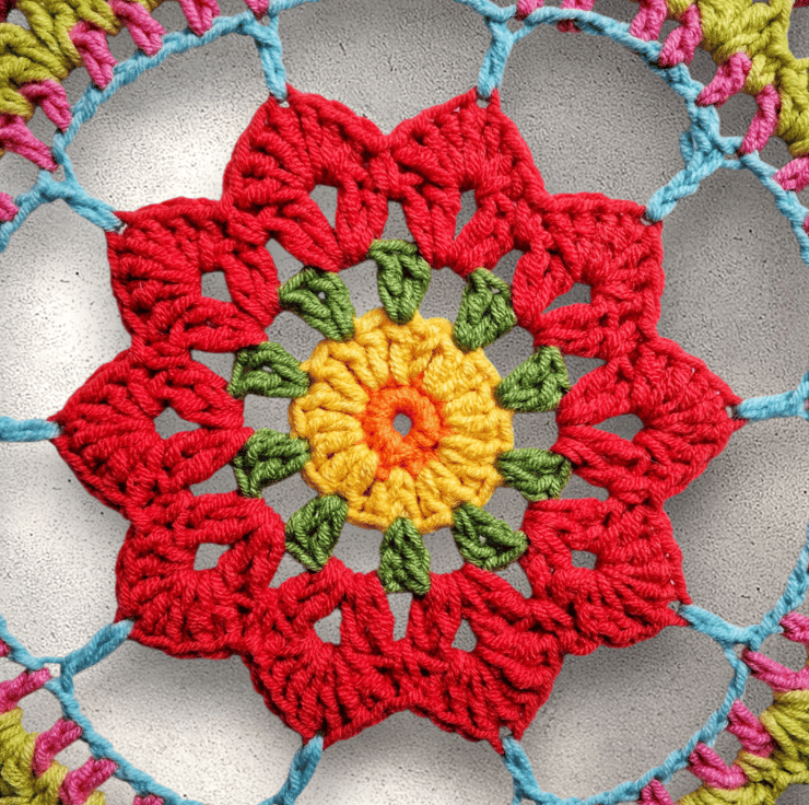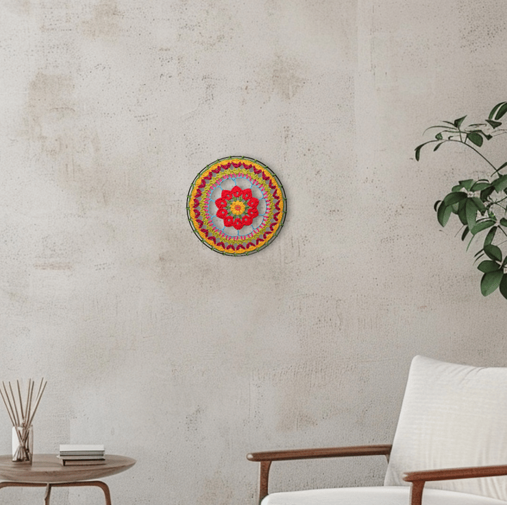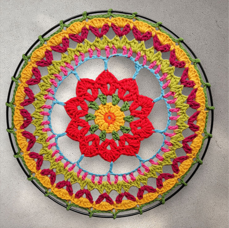 This colourful crochet mandala can be hung on the wall or at a window. It looks beautiful with the light filtering through. 25 cm diameter.