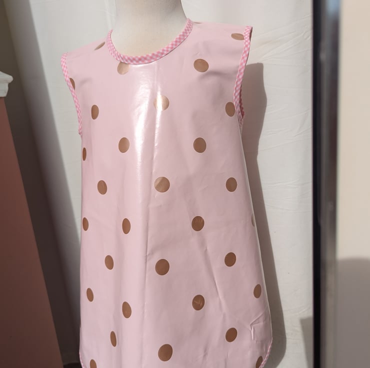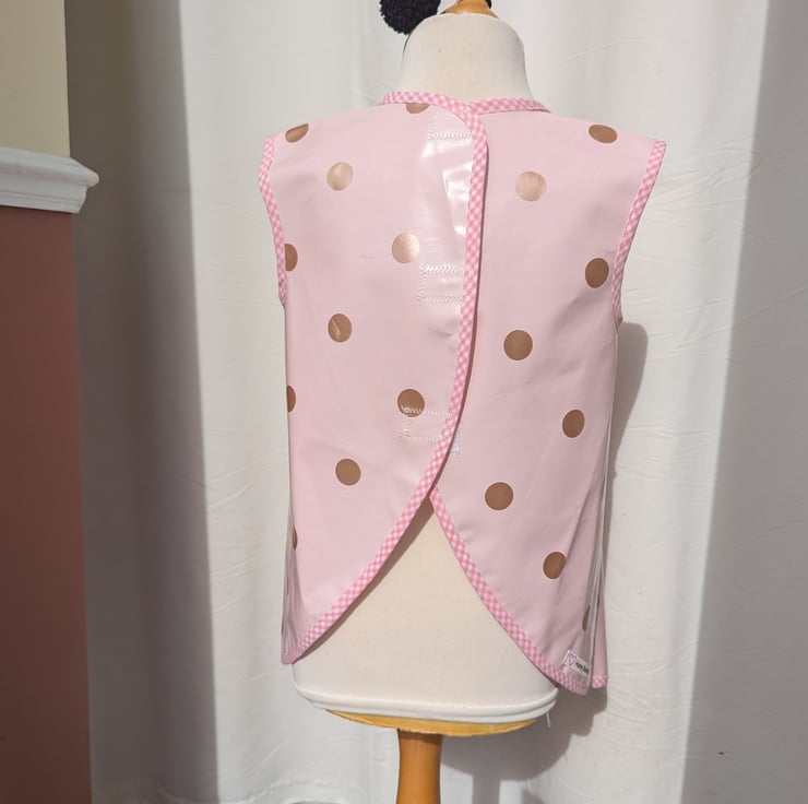 Hand made water repellent PU printed child's apron with pink gingham bias binding edging. Easily wiped clean for all those little messy projects. Ideal Velcro fastening for easy wearing.