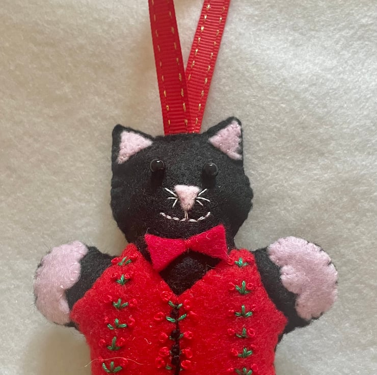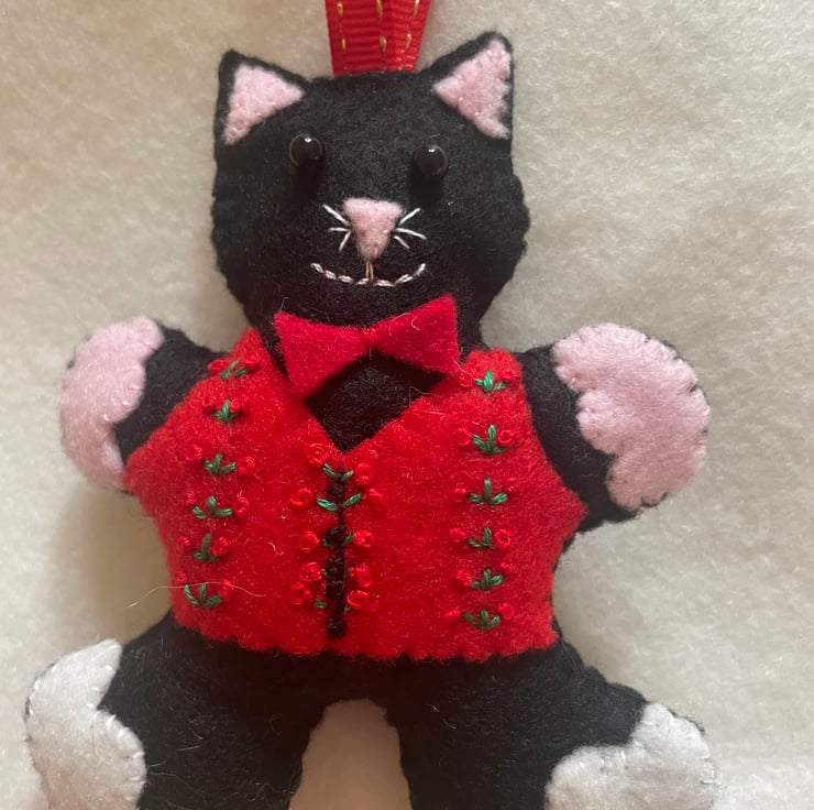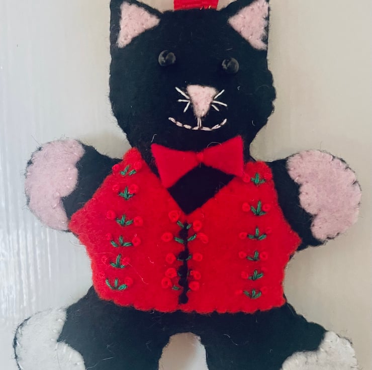 A cute little felt cat to hang from the tree this Christmastime or to give as a gift to a deserving cat lover. Hand embroidered to my own pattern and design, it’s never too early to start thinking about Christmas! Approximately 10cm in height with a red and gold ribbon hanging loop that is approximately 9cm. Please be advised that this is a decoration and not intended as a toy.