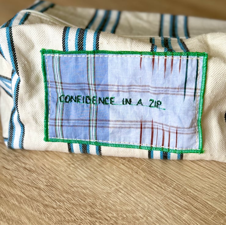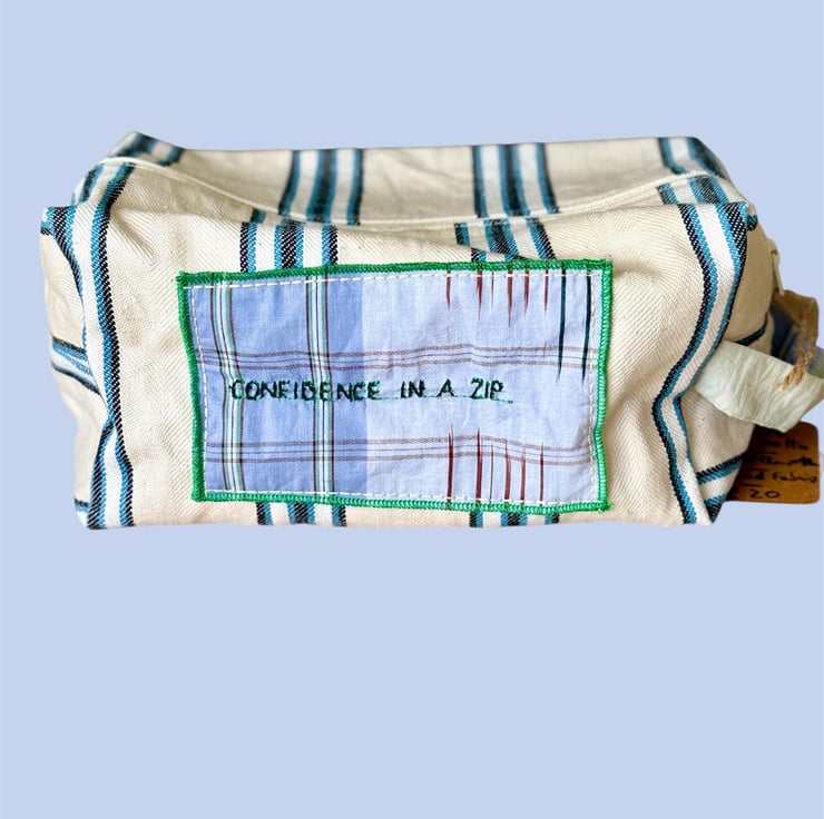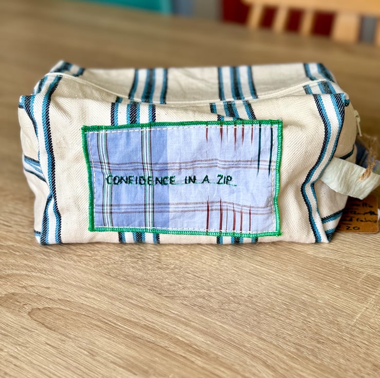 This handmade travel/toiletry bag is designed to bring a little joy, color, and confidence to your daily routine or weekend adventures – all while embracing sustainability.