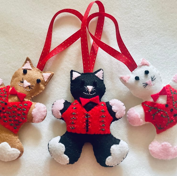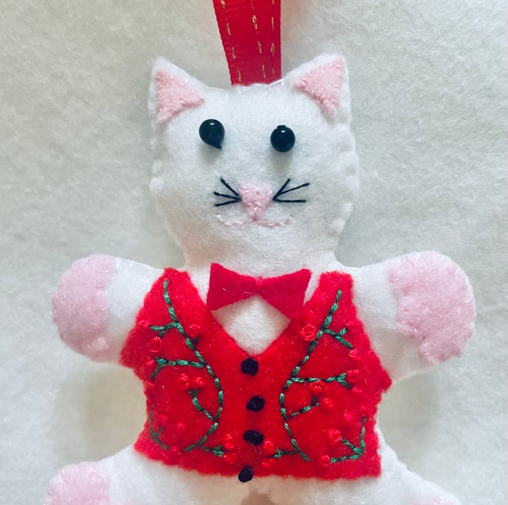 This white felt gingerbread cat is ready to scurry onto your Christmas tree! Made to my own design and completely hand sewn, this cute little cat is approximately 10cm long with a red and gold hanging ribbon (approximately 9cm drop). Please be advised that this has been made as a decoration and is not a toy.