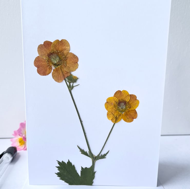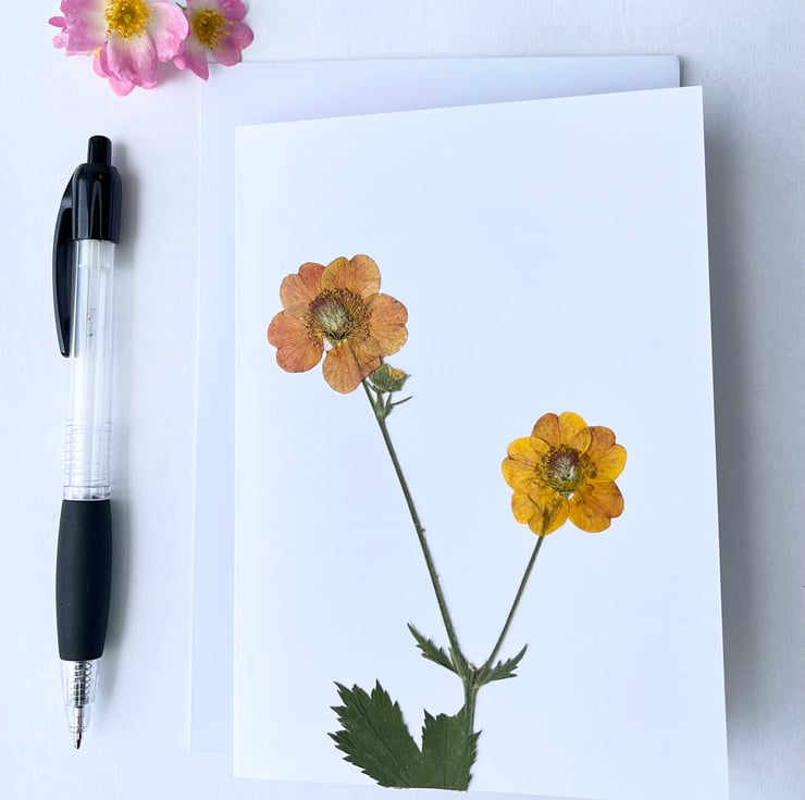 This lovingly handmade real pressed flower greeting card is made using geum from our garden.